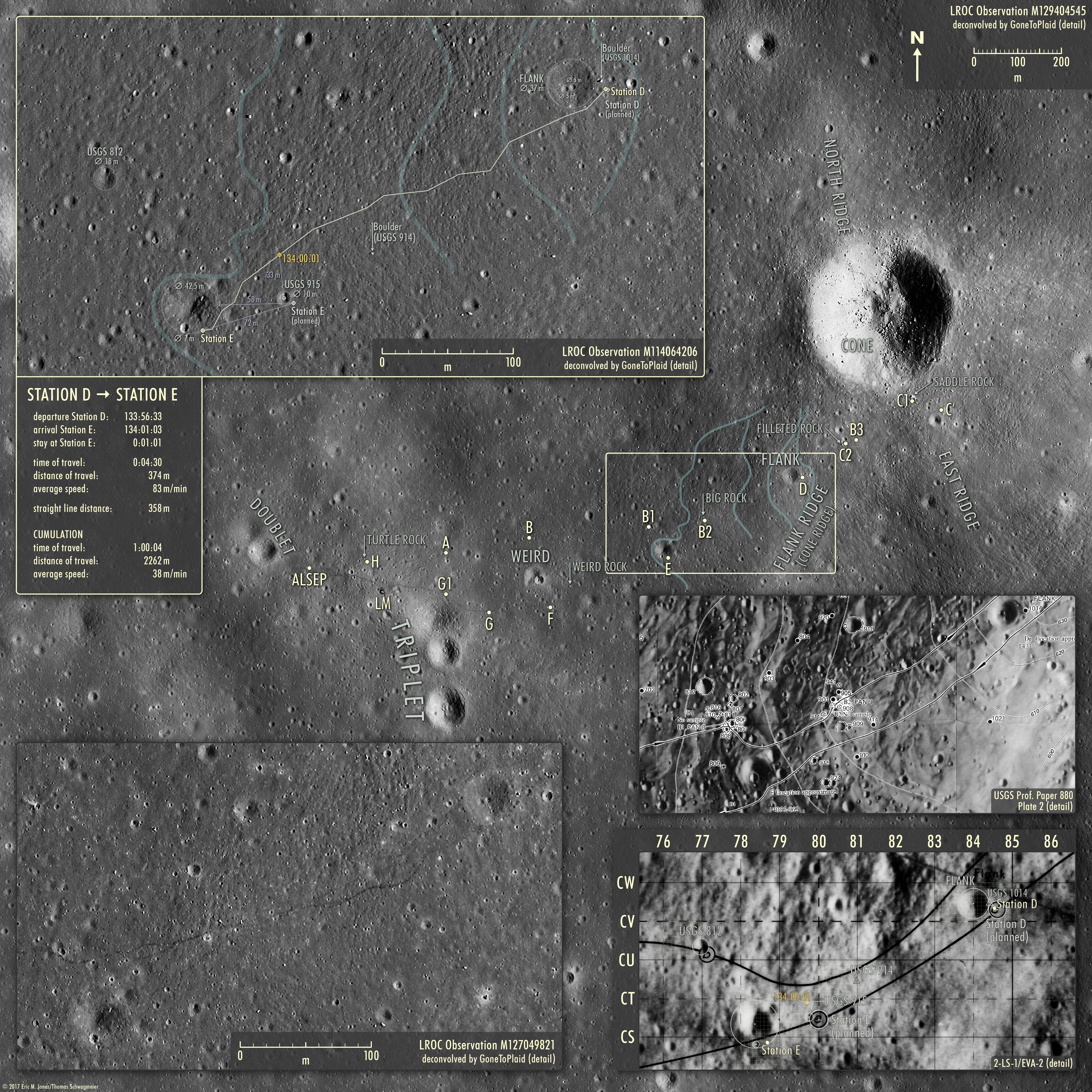 Von Station D bis hier waren Al und Ed knapp unterwegs und haben 290 Meter zurückgelegt, im Schnitt also 83 m/min (siehe Karte der Strecke von Station D bis Station E [Jones/Schwagmeier]). Sie sind jetzt ca. 35 Meter nördlich des Kraters 915 auf der USGS