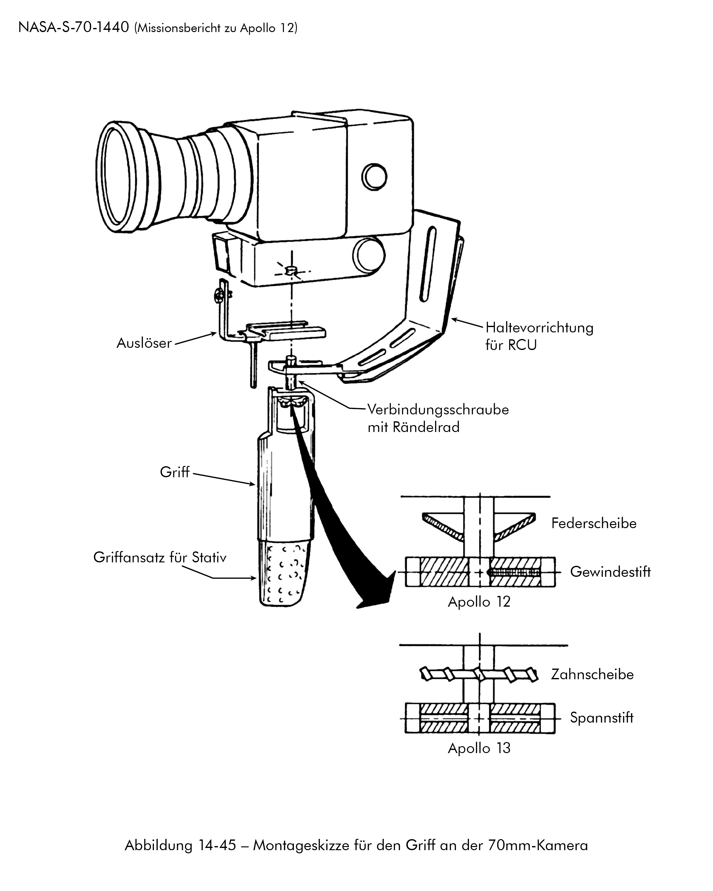 Scheinbar hat sich der Griff an seiner Hasselblad-Kamera gelockert, wie schon anderthalb Stunden zuvor bei . Abbildung 14-45 aus dem Missionsbericht zu Apollo 12 (Apollo 12 Mission Report) veranschaulicht das Problem, das auch bei anderen Missionen aufgetreten ist.