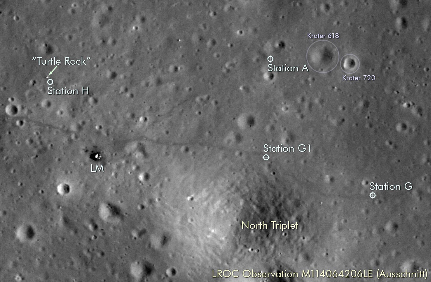 Al und Ed haben Station G erreicht. Die Auswertung nach dem Flug ergab die Koordinaten CP,6/70,7 auf Karte 2-LS-1/EVA-2 (Ausschnitt des westlichen Teils). Siehe auch die Karte der Strecke von Station F bis Station G (Jones/Schwagmeier). Dort befinden sie sich allerdings nur etwas mehr als einen halben Kraterdurchmesser östlich von Krater Nord-Triplet. Eine Methode zur Bestimmung des Abstands wäre, den Winkel zu schätzen, über den sich der Krater von einer Seite zur anderen im Sichtfeld erstreckt. Im Abstand vom 1,5-fachen Kraterdurchmesser zur Kratermitte – somit einen Kraterdurchmesser bis zum Rand – sind es ca. 40°, beim 2,5-fachen Durchmesser etwa 23°.