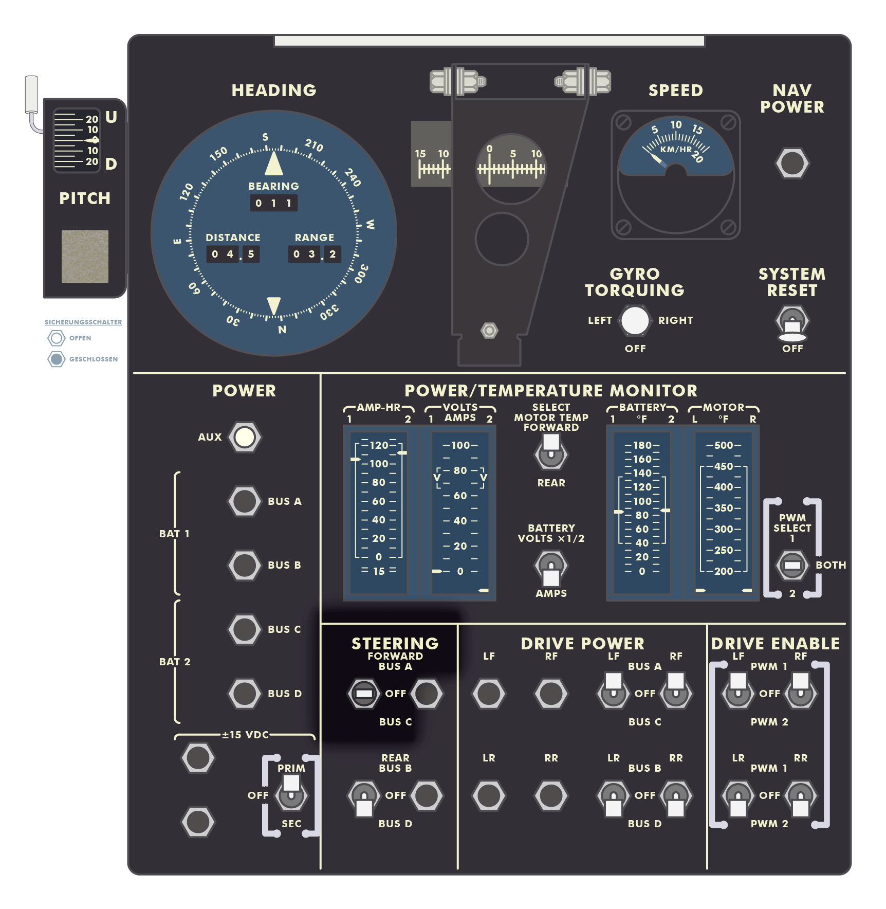 Irwin: Okay. Wir fahren wieder mit 7 (bis) 8 Klicks. Fahrtrichtung 1︱8︱0. (LRV‑Konsole)