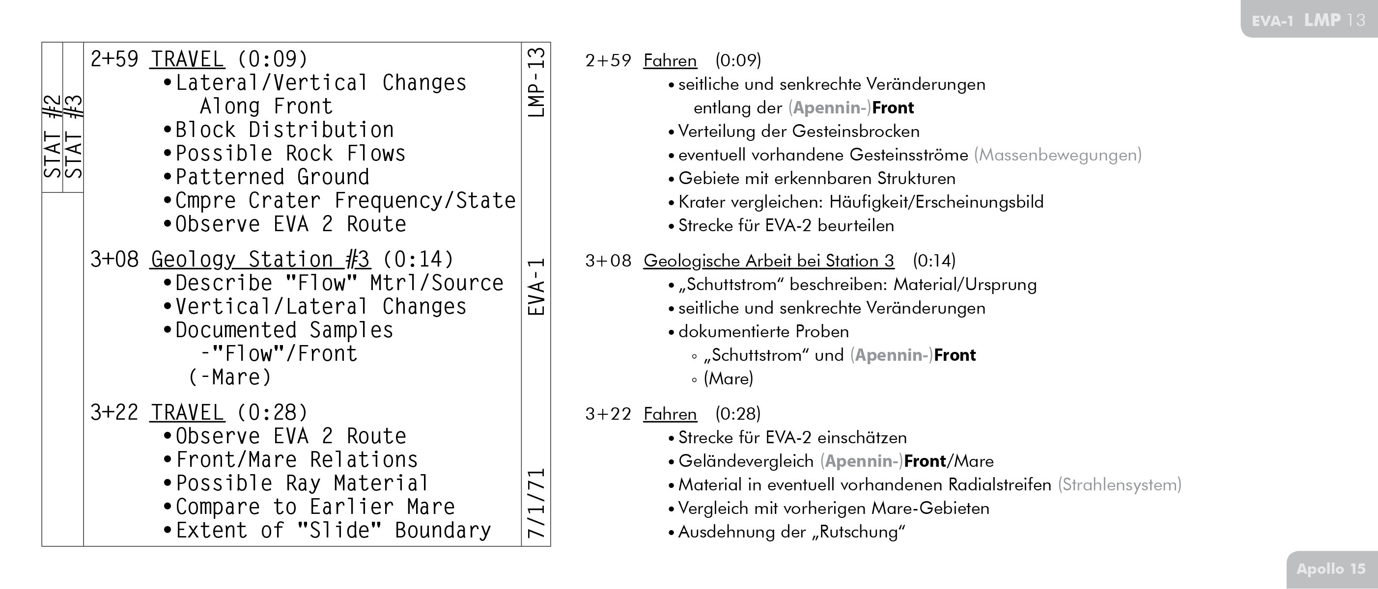 SEQScientific Equipment (Bay)‑Ladebucht parken. Die Ladebucht befindet sich in Quadrant 2, dem südöstlichen Teil der Landestufe. Abbildung 3.1-5 im Ablaufplan für die Arbeit auf der Mondoberfläche bei Apollo 15 (Apollo 15 Final Lunar Surface Procedures) illustriert die Situation. Die zwei Vorgaben in der Checkliste widersprechen sich offenbar, da die Fahrzeugfront bei einer Ausrichtung nach Südosten von der Ladebucht weg zeigt. Tatsächlich parkt Dave südöstlich der Ladebucht in Richtung Nordwesten. Das wissen wir, weil Jim bei die Fahrzeugausrichtung 315 angibt, was genau Nordwesten entspricht. Außerdem hat Dave bei Probleme, die Hochgewinnantenne (HGA