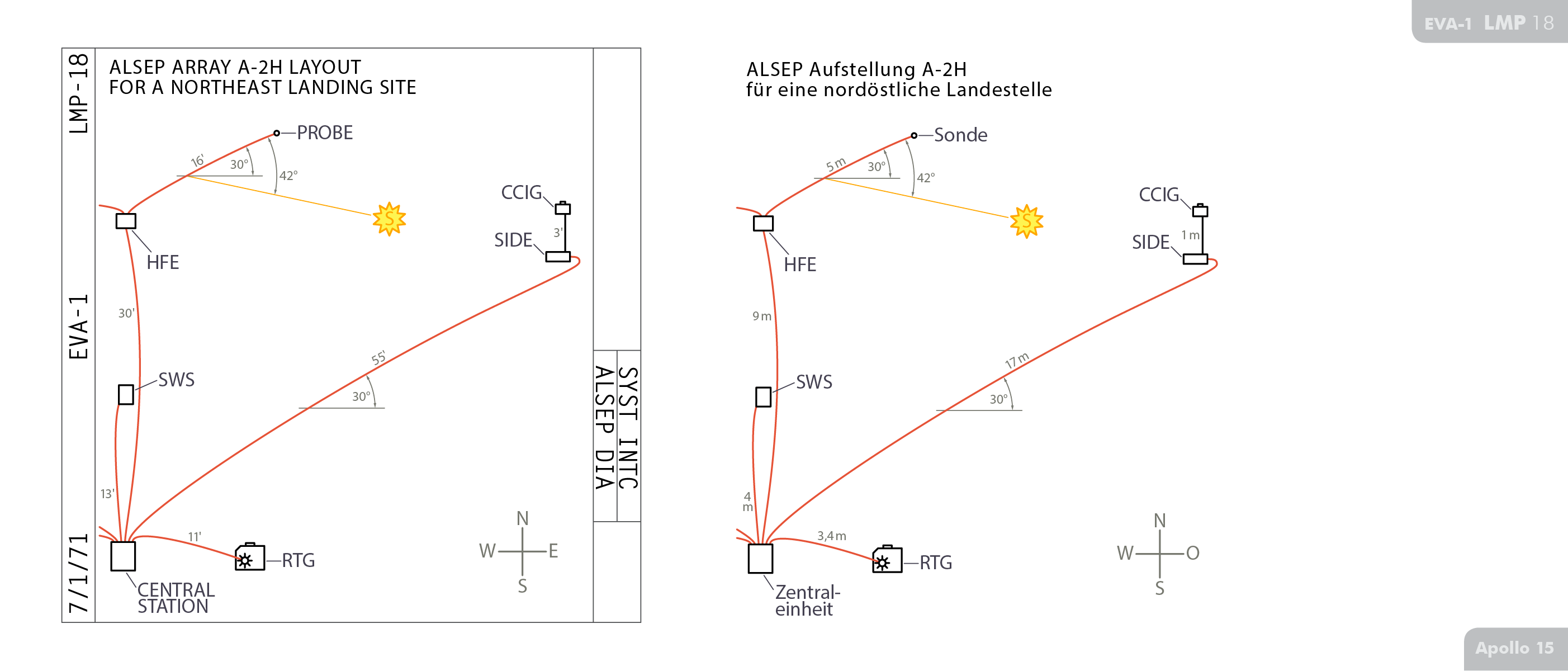 ALSEPApollo Lunar Surface Experiments Package auf CDR-18 und LMP-17/LMP-18 in den Manschetten‑Checklisten.