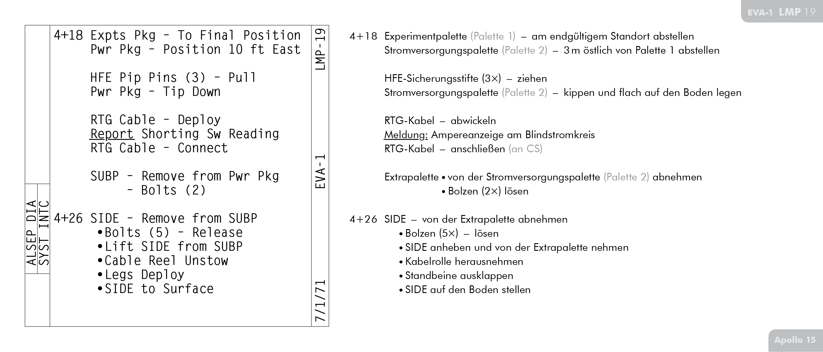 LMLunar Module findet sich auf Seite 71 im Ablaufplan für die Arbeit auf der Mondoberfläche bei Apollo 15 (Apollo 15 Final Lunar Surface Procedures).
