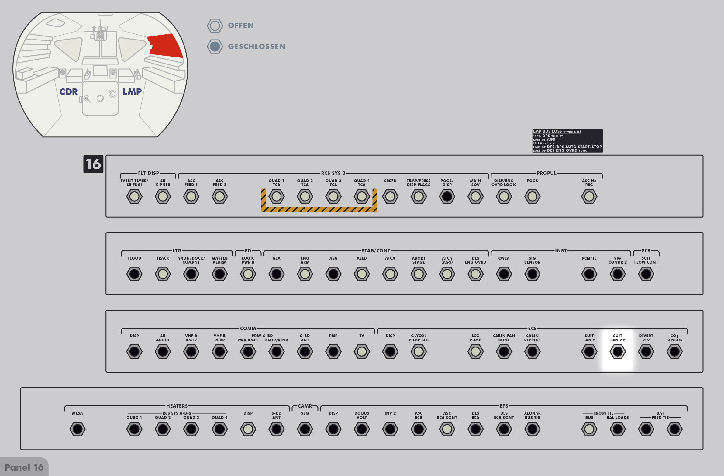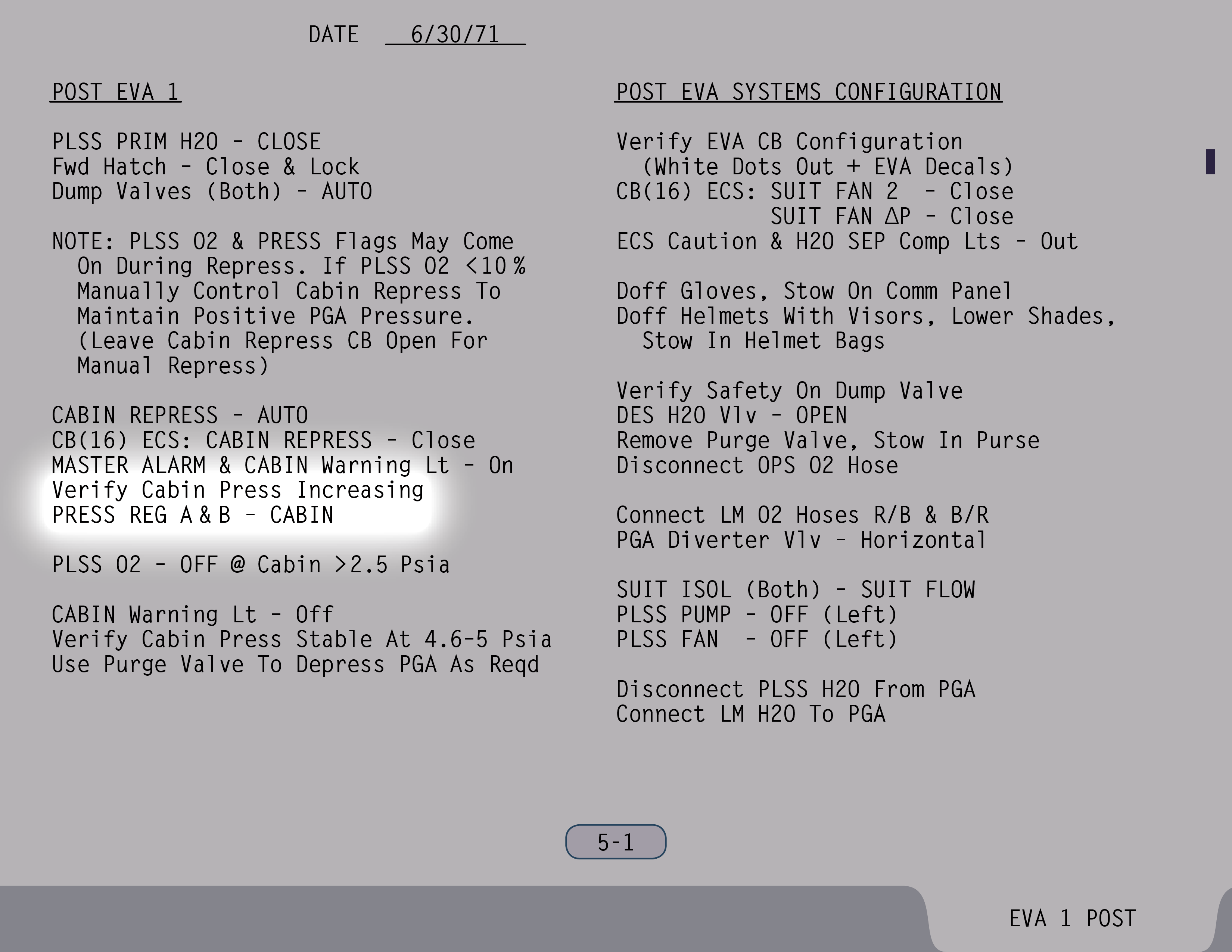 Jim denkt hier kurz, er hätte zuerst den Sicherungsschalter Kabinendruckwiederherstellung auf Paneel 16 schließen müssen, bevor er das Ventil Kabinendruckwiederherstellung umstellt. Es passierte selten, aber wenn den Apollo‑Besatzungen bei den Verfahrensweisen tatsächlich ein Fehler unterlief, dann meistens, weil sich die Astronauten eher auf ihr Gedächtnis verließen, anstatt in der Checkliste zu lesen. Ein Beispiel dafür sind die Probleme von Pete Conrad und Al Bean während der Vorbereitung auf EVA‑1