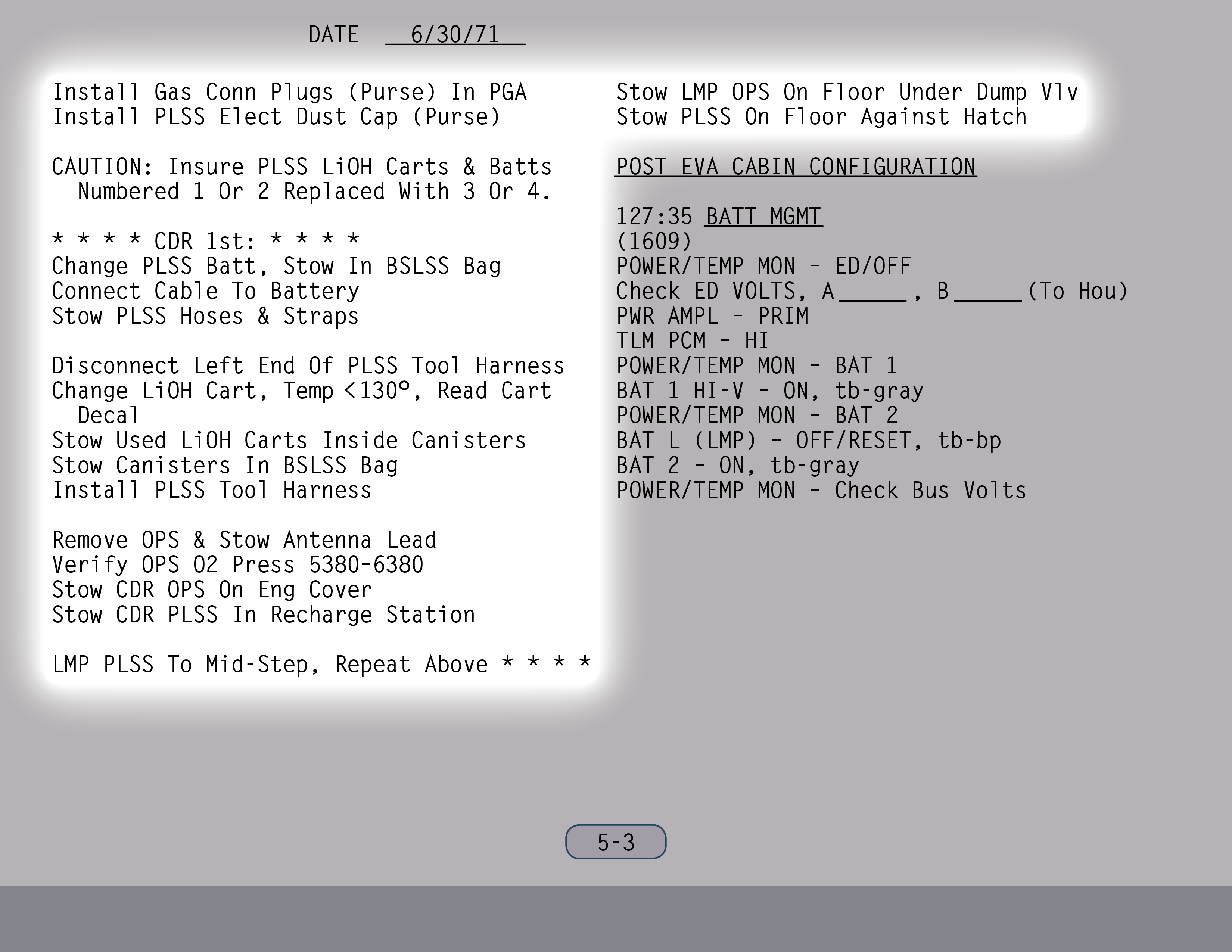 PLSSPortable Life Support System kümmern. Sie füllen den Sauerstoff abschließend auf und tanken Wasser. Die Schritte dazu stehen auf den Seiten SUR 5-5 und SUR 5-6 der Checkliste. Anstatt beides nacheinander zu tun, wollen sie Zeit sparen und kippen Jims PLSS