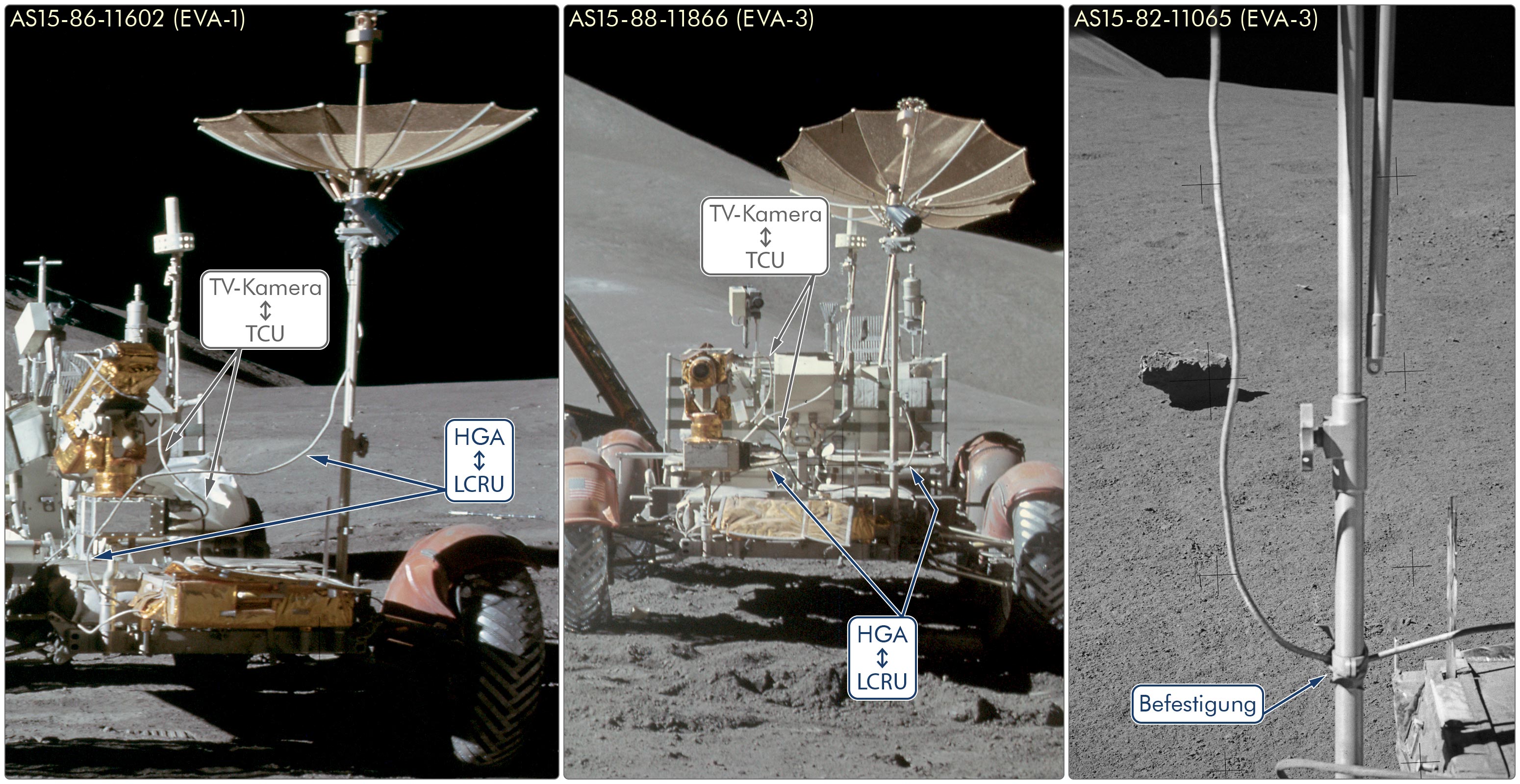Vor AS15-85-11471 macht Jim einen Schritt nach links und vergrößert zusätzlich den Abstand zum Fahrzeug. Rechts neben dem Antennenmast der HGA