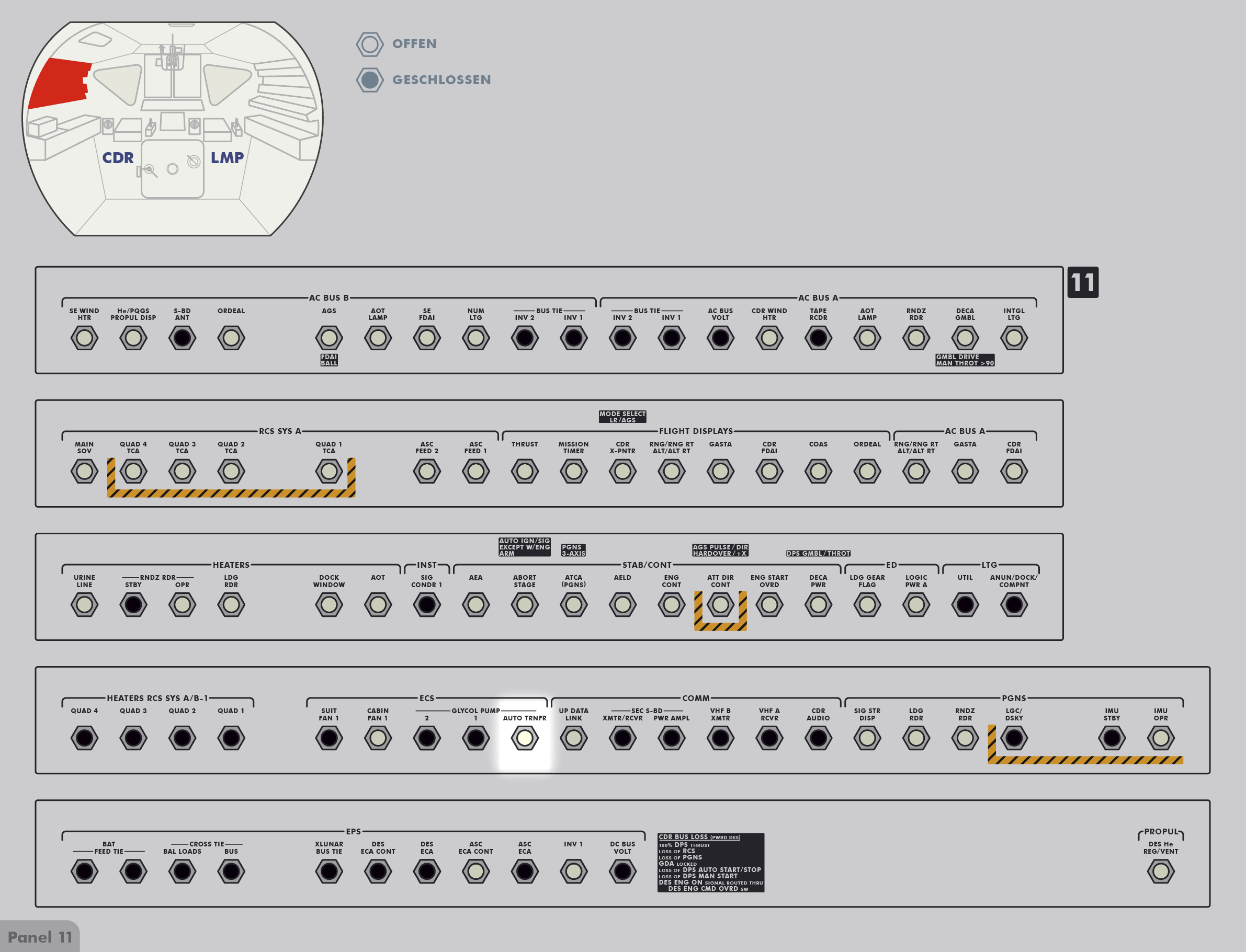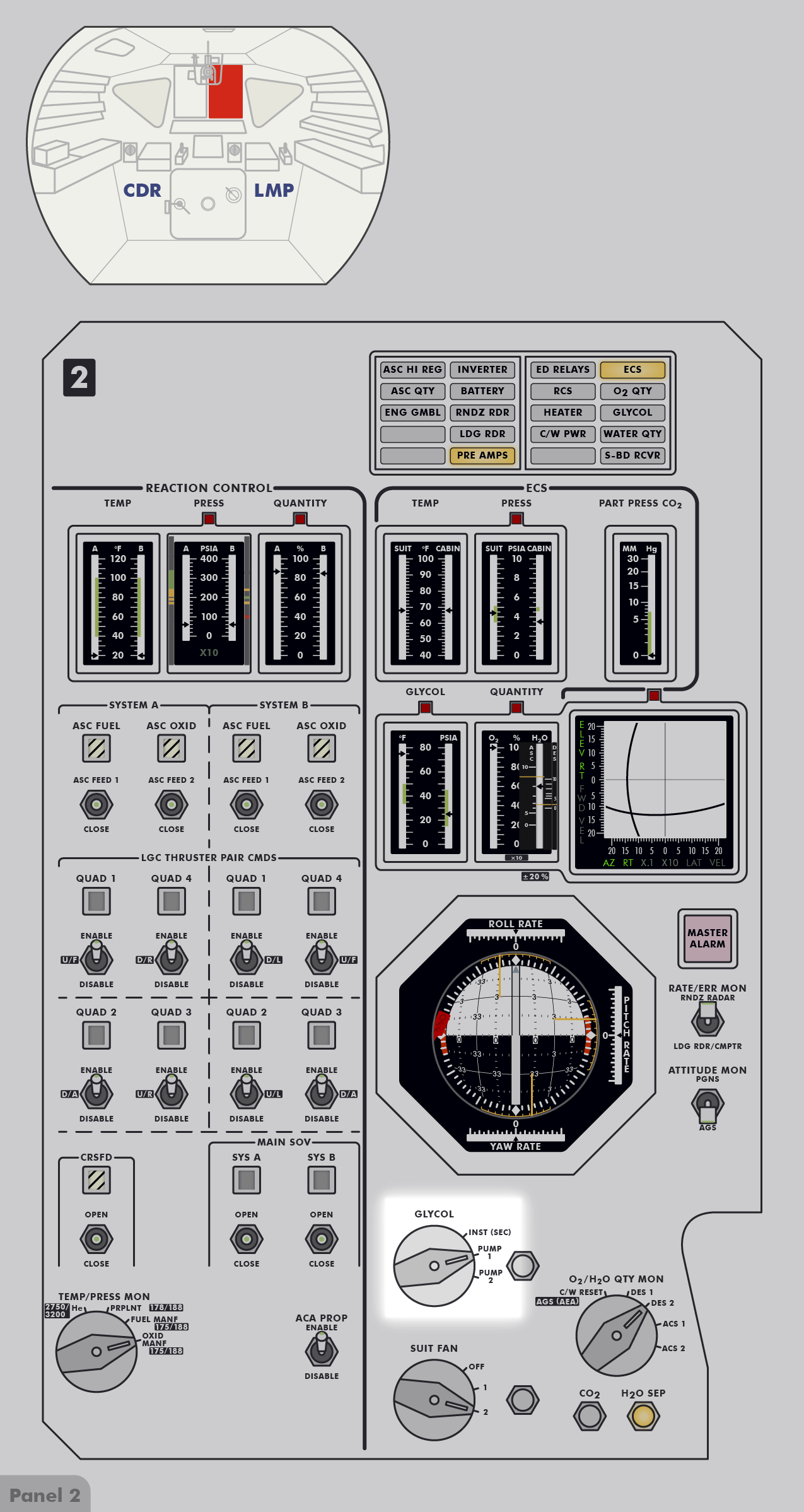 LGALow-Gain Antenna) auf ihrem Stativ links neben der Schalter- und Instrumentenkonsole. In der Tasche hinten an Jims Rückenlehne befindet sich das BSLSS