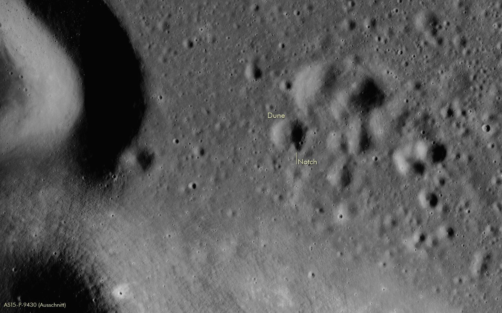 ist Krater Last, dessen Durchmesser in Wirklichkeit etwa 200 Meter beträgt. Den kleinen Krater an der östlichen Kraterwand sieht man gut in einem Ausschnitt von AS15-P-9809, aufgenommen mit der Panoramakamera (im SIM