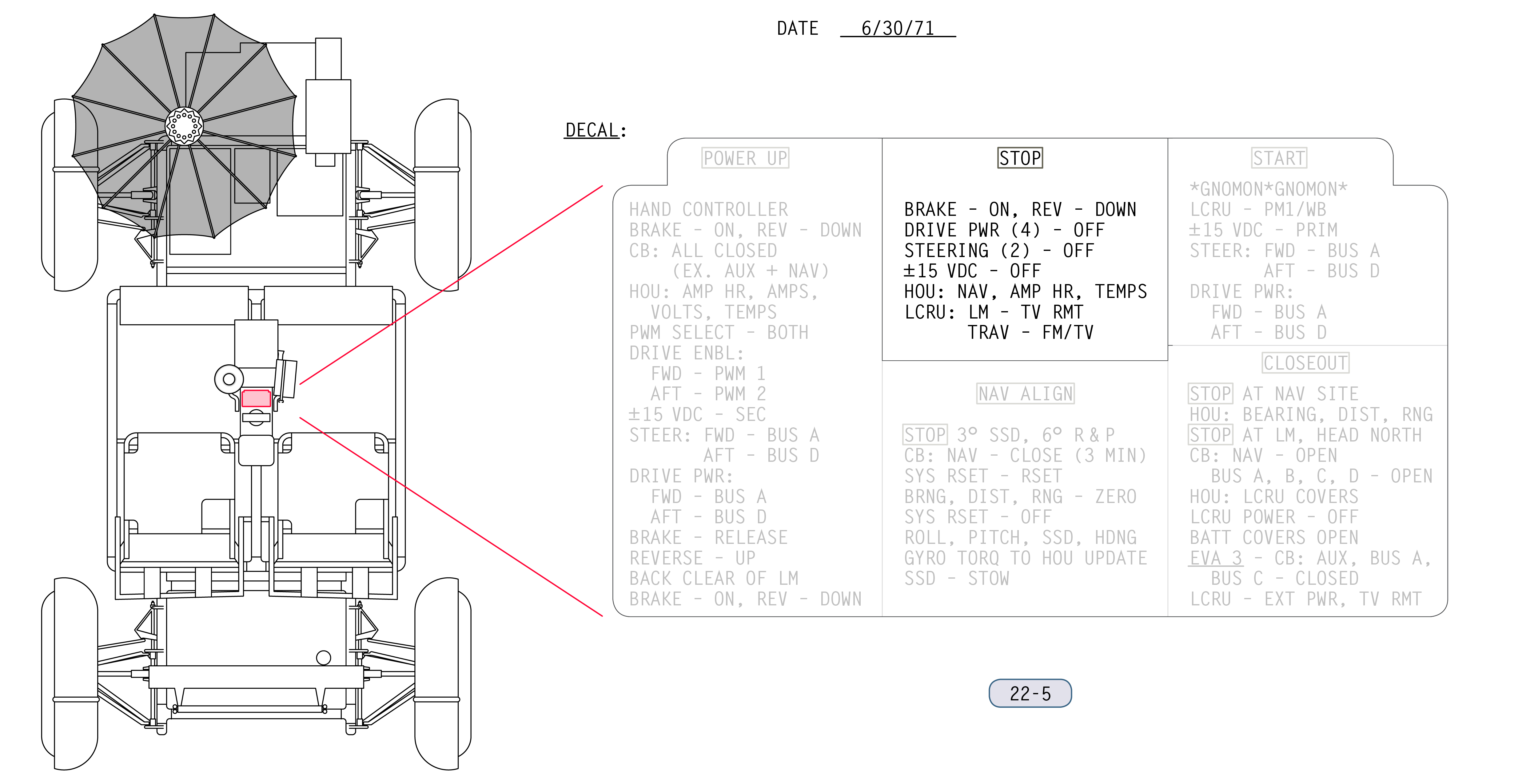 Scott: Bremse ist angezogen, (Motor-)Stromversorgung ist ausgeschaltet. (LRV-Paneel, SUR 22-5)