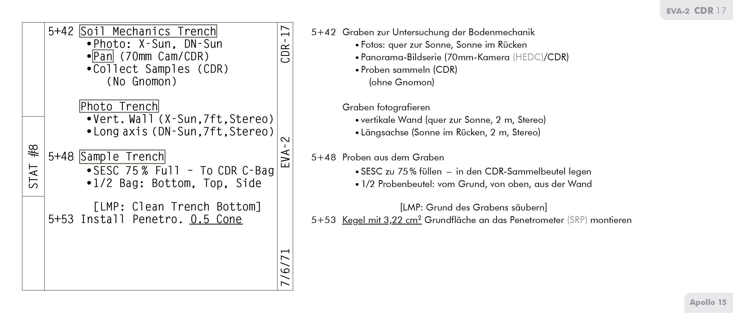 SEVAStand-Up Extravehicular Activity) ein paar großartige Fotos mit dem 500mm-Teleobjektiv gemacht. Diese Fotos überzeugten mich, dass die Krater bei Einschlägen entstanden, weil in den Randablagerungen eindeutig weiße Brekzienfragmente zu sehen sind. Dave brachte das Teleobjektiv wieder mit. Er verstaute es unter seinem Sitz (im CM