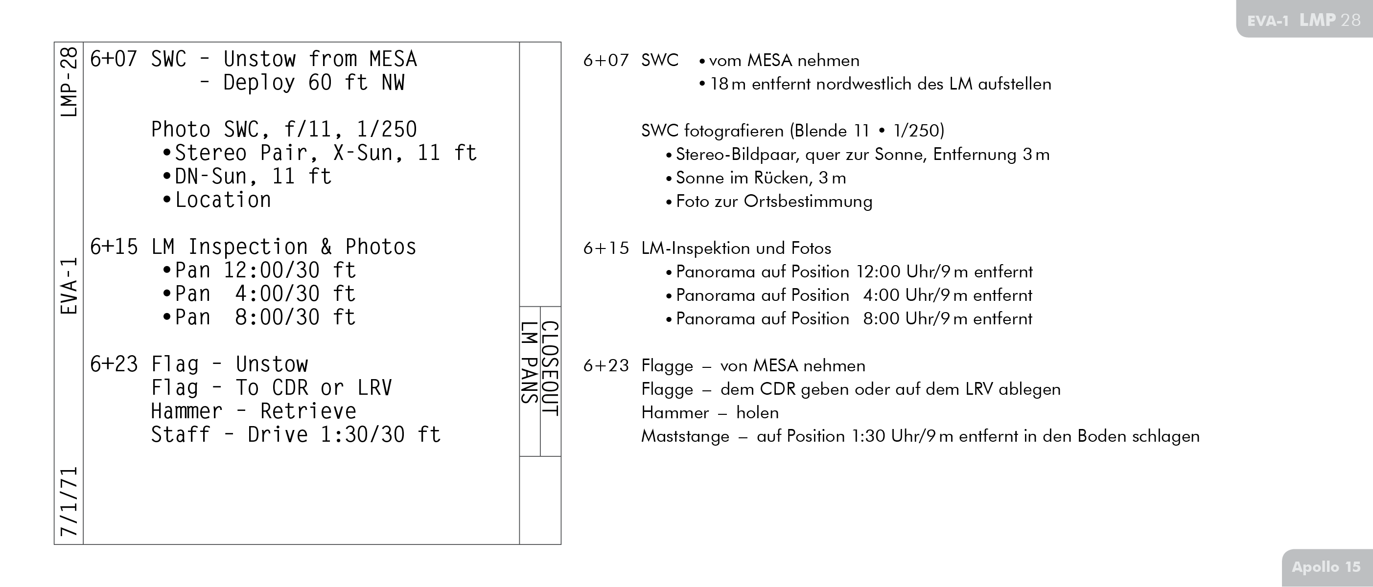 LDACLunar Surface Data Acquisition Camera) ausschalten. Der Film ist vermutlich durchgelaufen. Außerdem hätten wir gern die Klicks (Geschwindigkeit) und AMPs