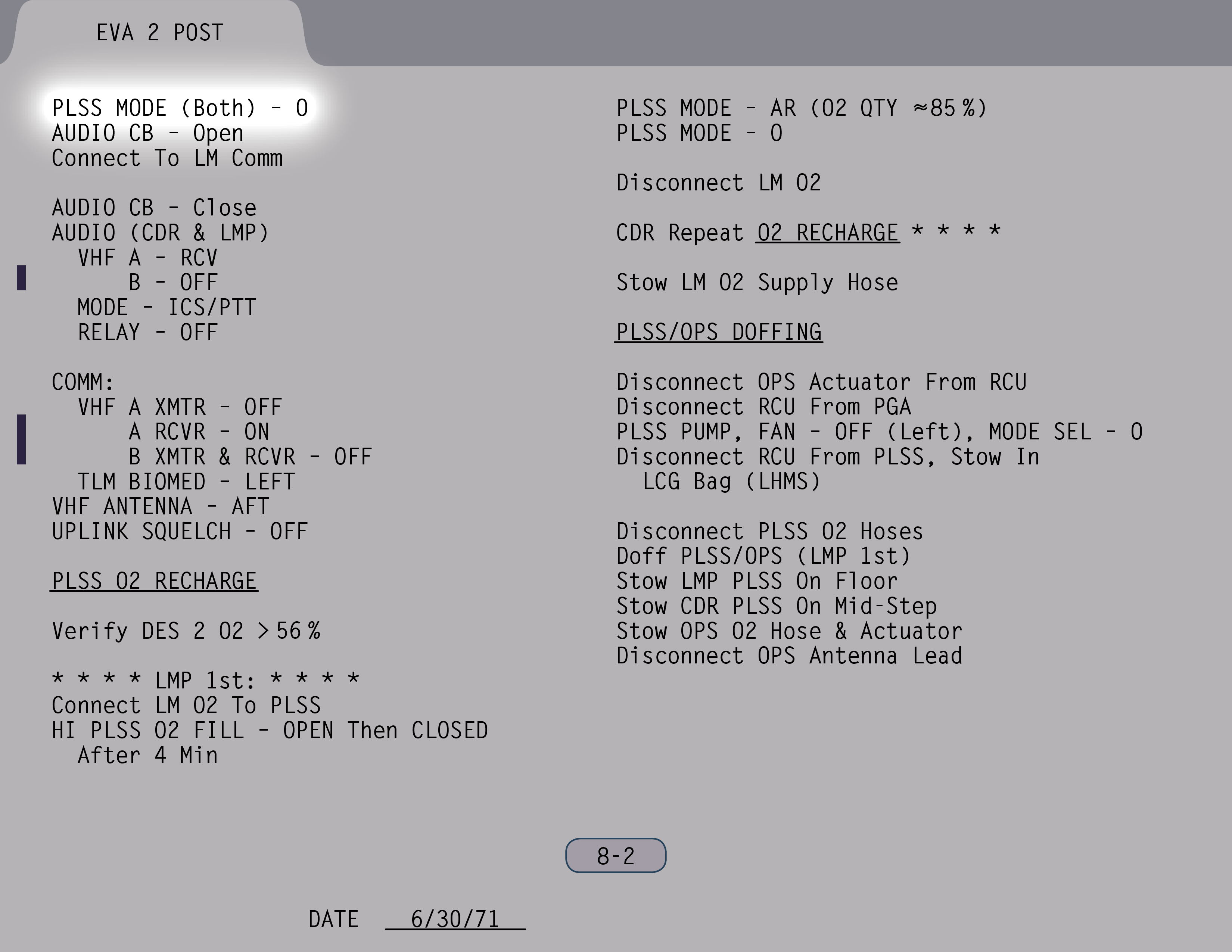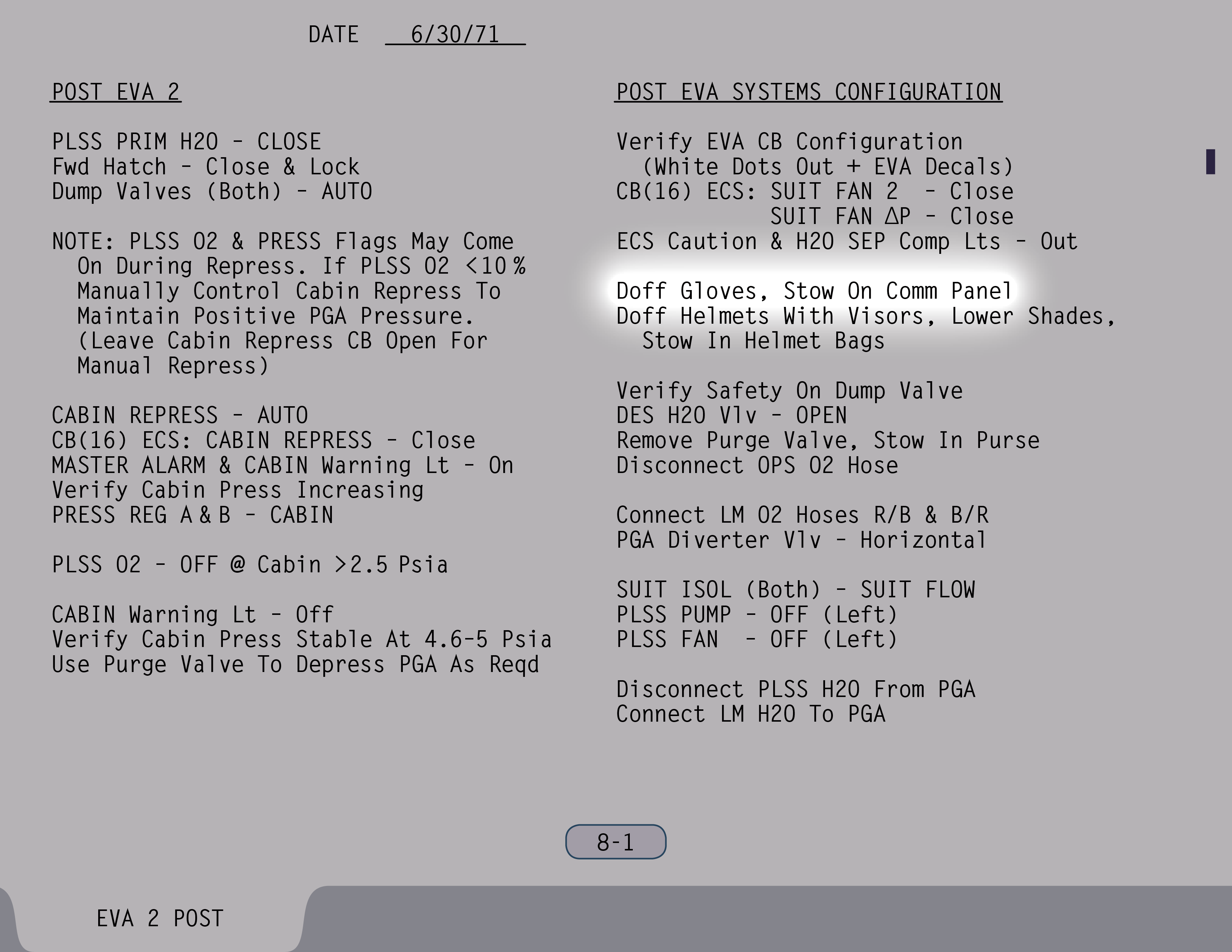 Damit ist Seite SUR 8-1 der Checkliste für den Aufenthalt auf der Mondoberfläche bei Apollo 15 (Apollo 15 LM Lunar Surface Checklist) abgearbeitet.