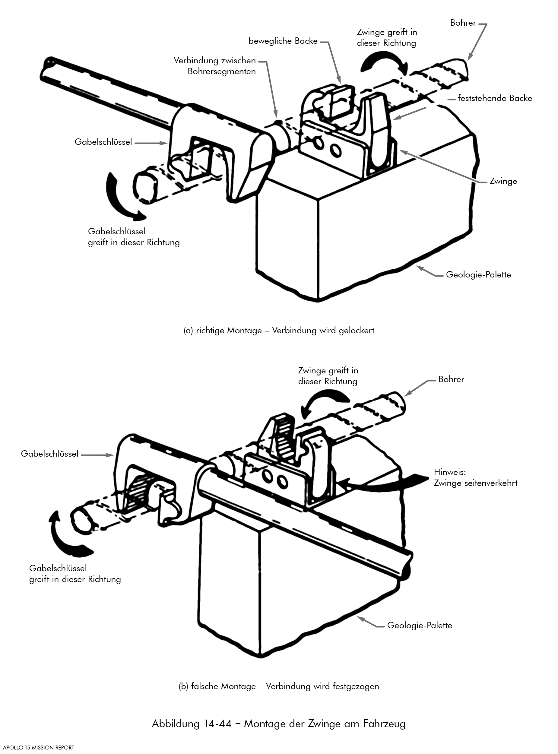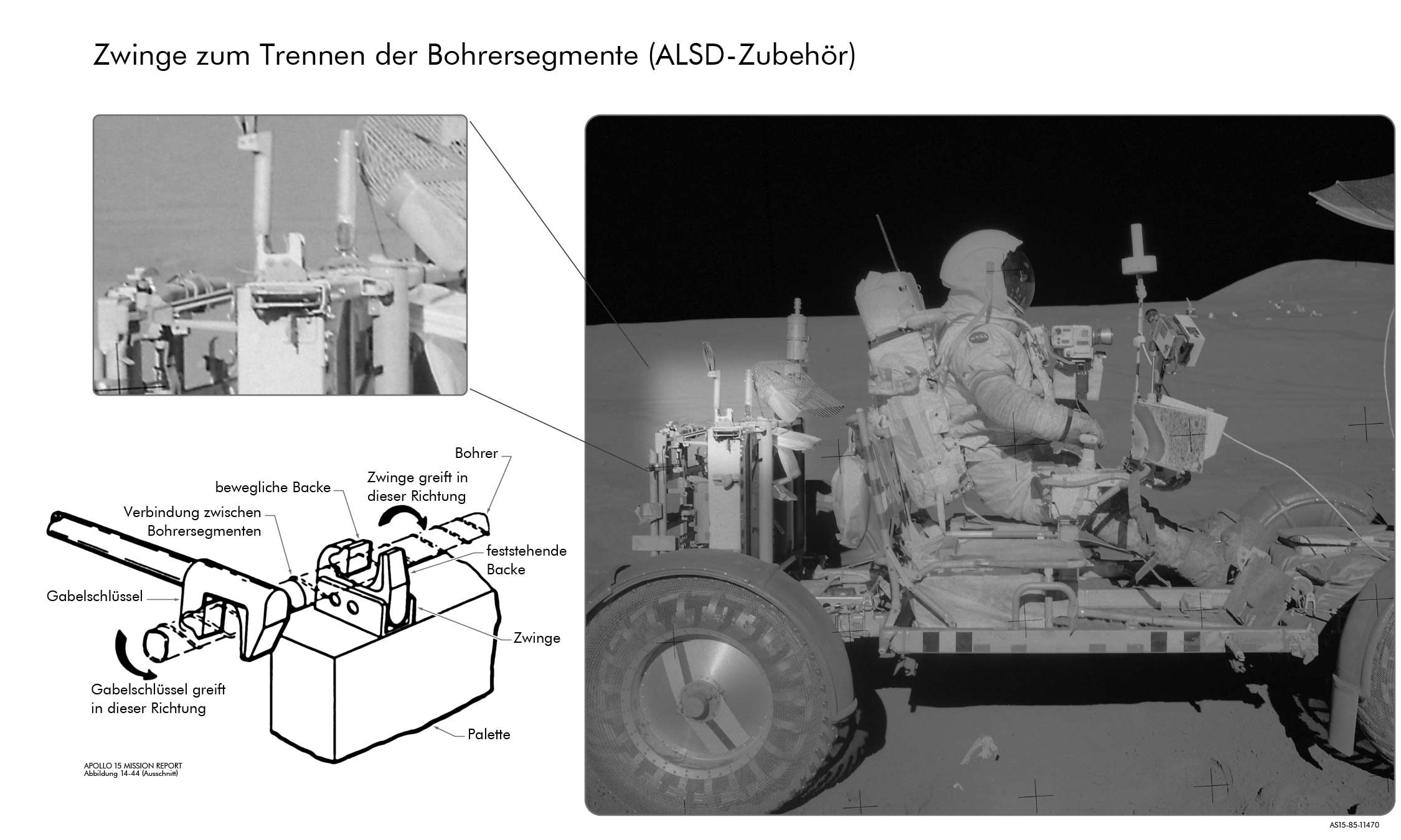 Allen: Dave, bevor du losfährst, überprüf bitte, ob deine Fahrtrichtungsanzeige auf 2︱9︱2 steht. (LRV‑Konsole)
