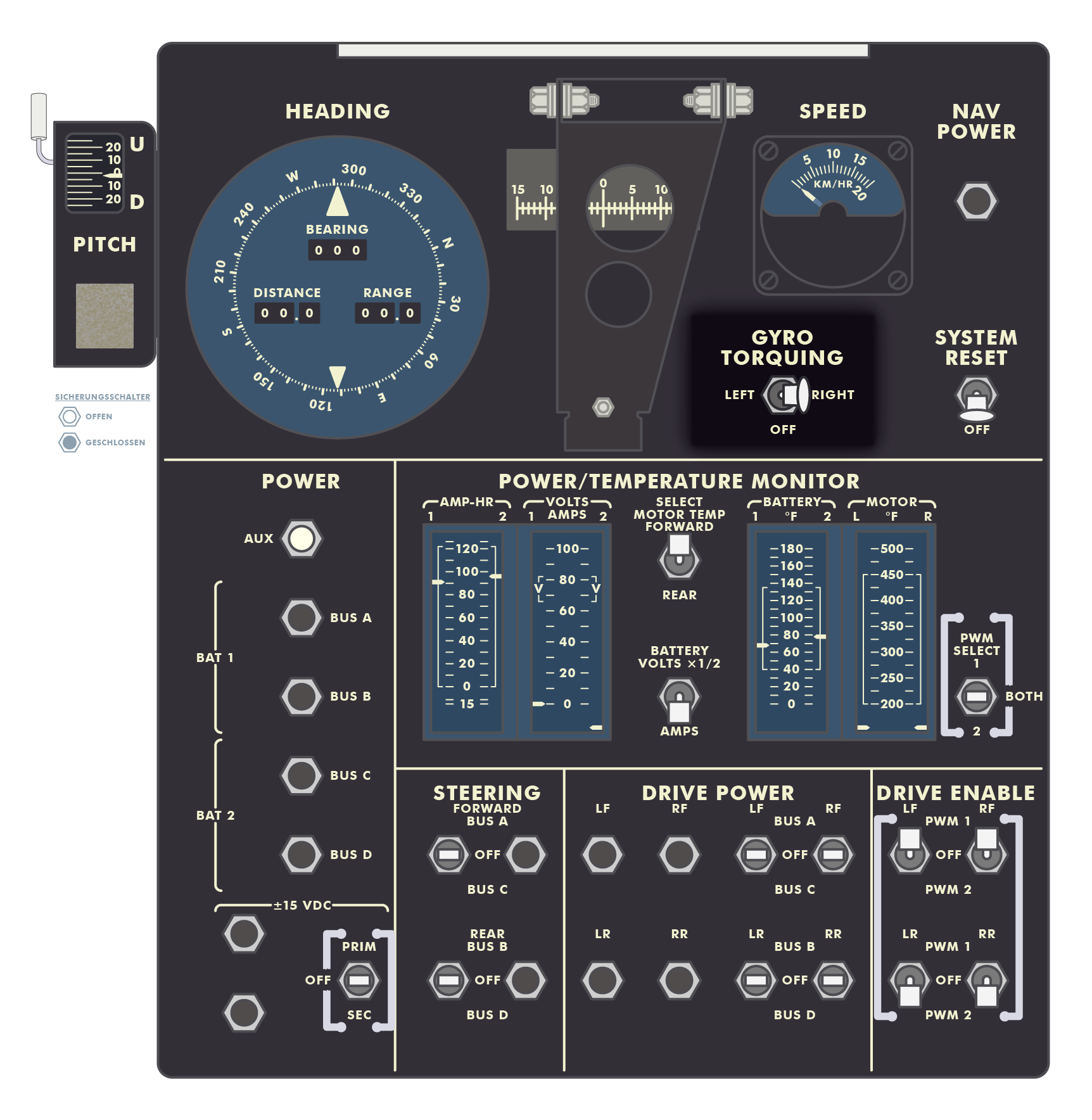 HGAHigh-Gain Antenna vor dem Fahrzeug stehen. Da es mit der Front nach Westen zeigt, blickt Dave nach Osten und somit fast genau Richtung Sonne, wenn er in der ohnehin lichtschwachen Peiloptik die Erde sucht. Durch Ablesen der Signalstärke kann die Antenne auch mithilfe der AGC
