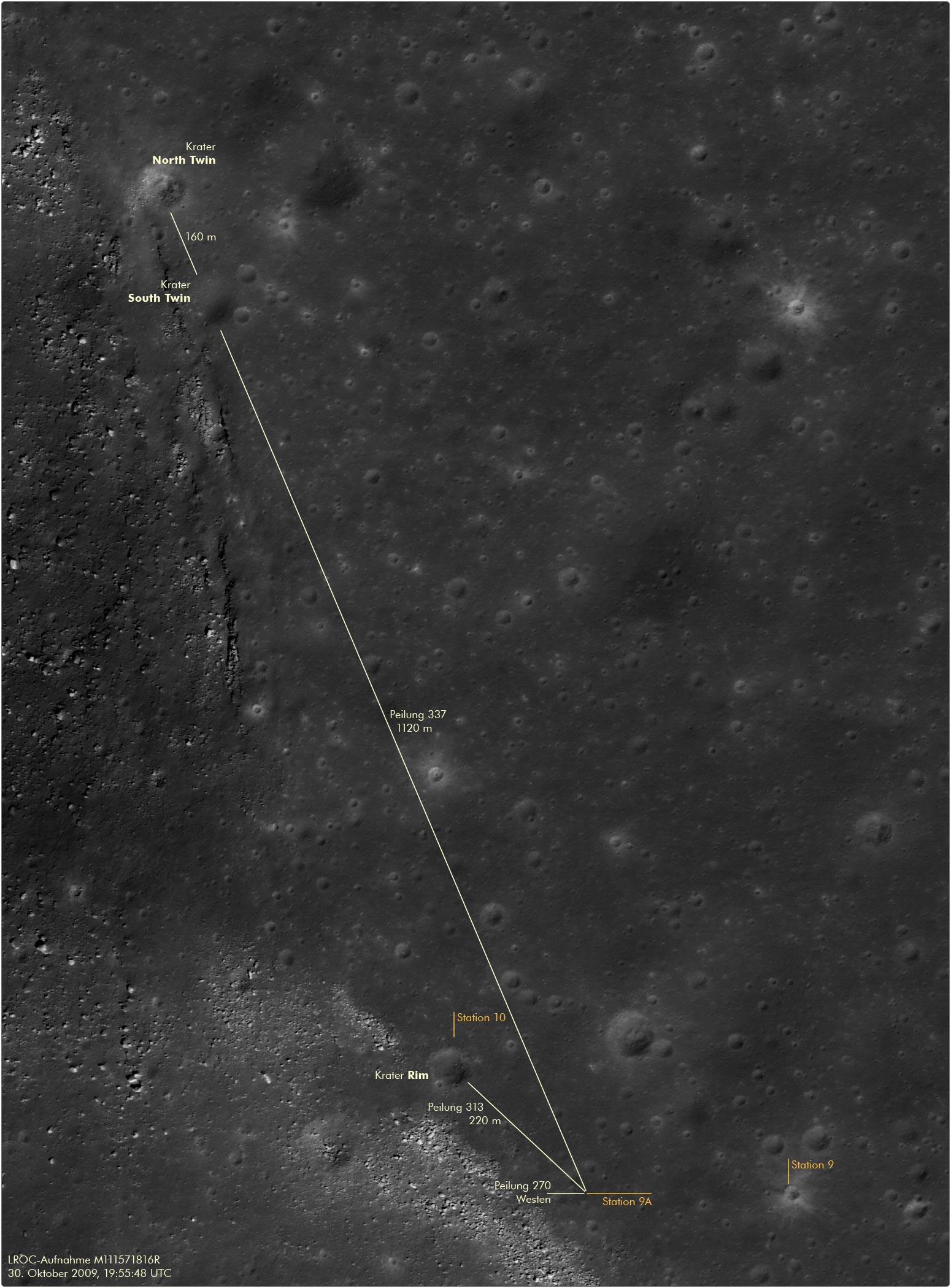 Wie die LROC‑Aufnahme M111571816R zeigt, liegen die Krater North Twin und South Twin etwas über 1 Kilometer von Station 9A entfernt bei Peilung 337. Bis zu Krater Rim, wo Dave und Jim für Station 10 anhalten werden, sind es dagegen nur rund 220 Meter bei Peilung 313.