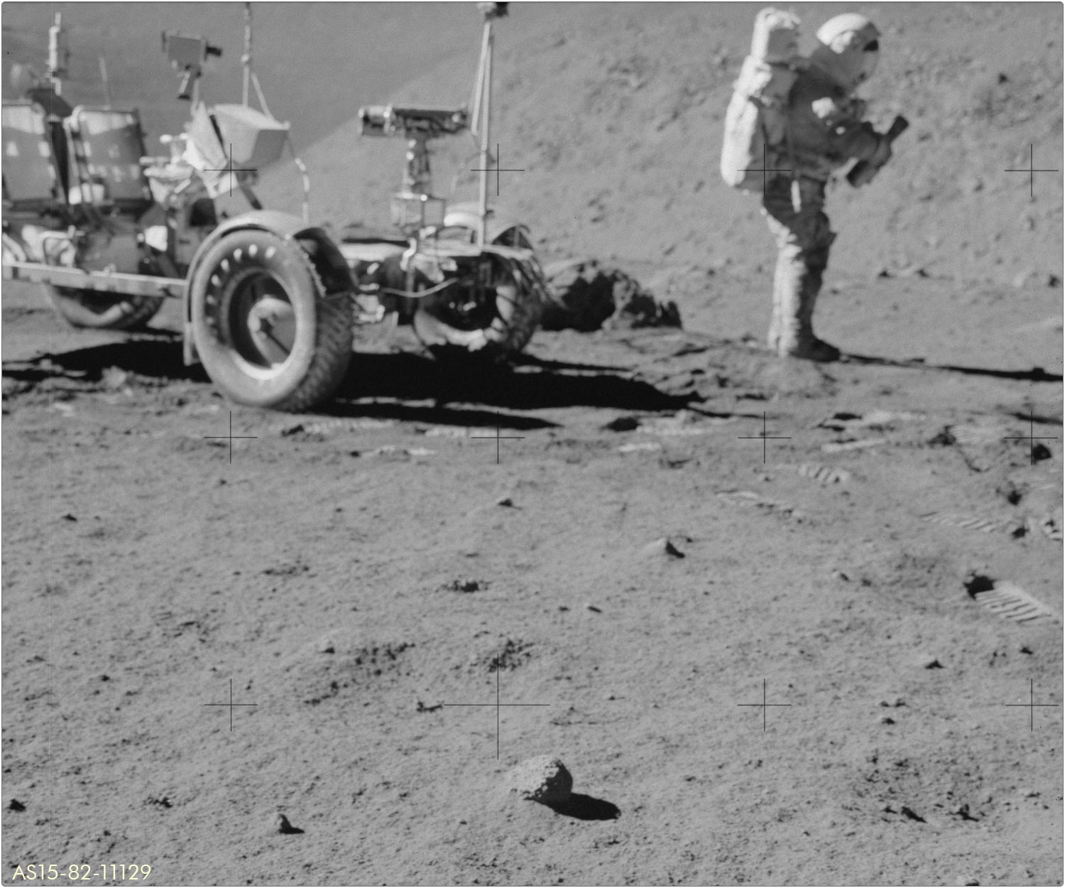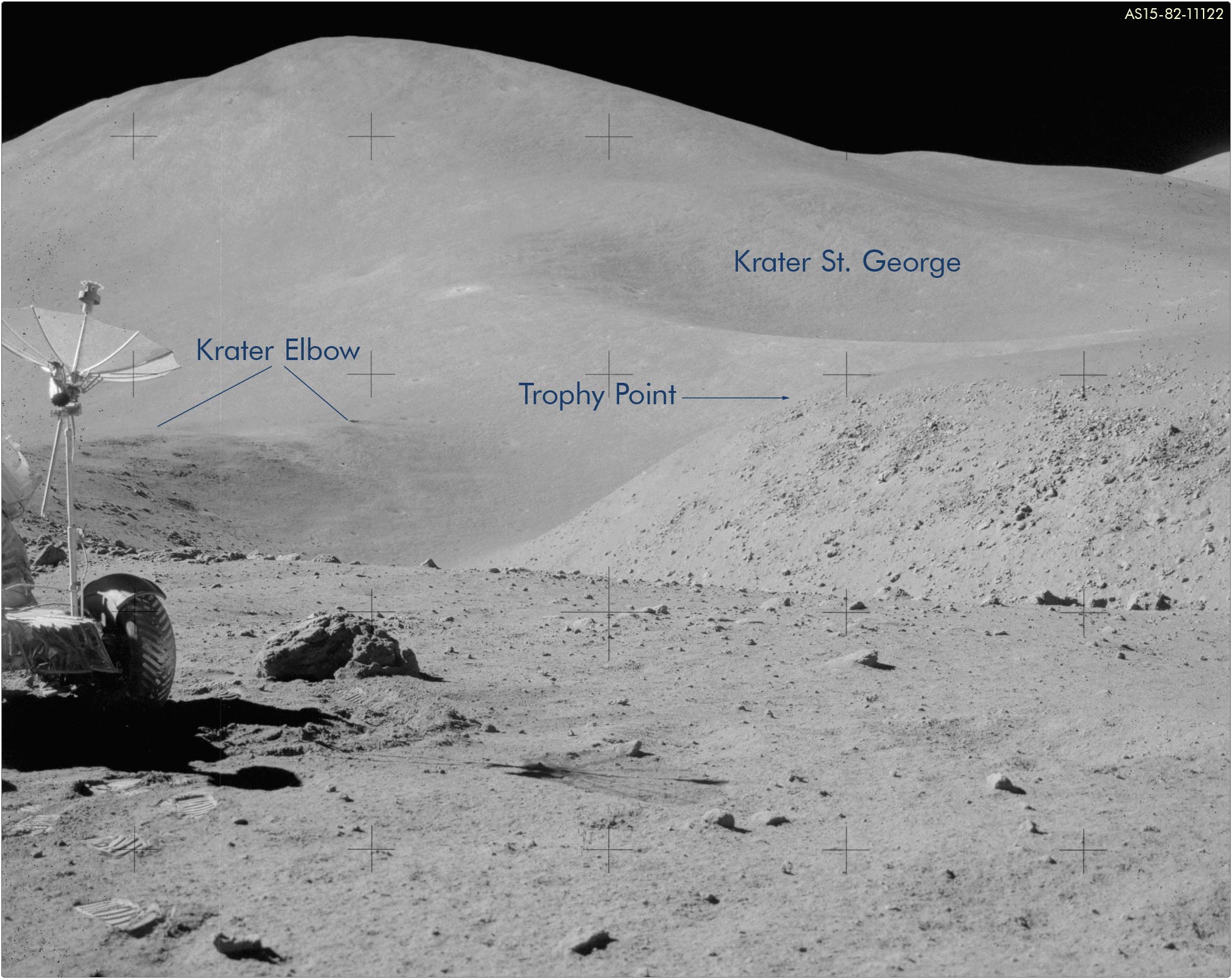 LRVLunar Roving Vehicle stand und wo Jim die Panoramaserie fotografierte. Dave parkte das Fahrzeug neben einem Felsbrocken, zu sehen auf AS15-82-11121 und AS15-82-11129. Vermutlich ist es der Brocken, den man auch auf der LROC‑Aufnahme erkennt.