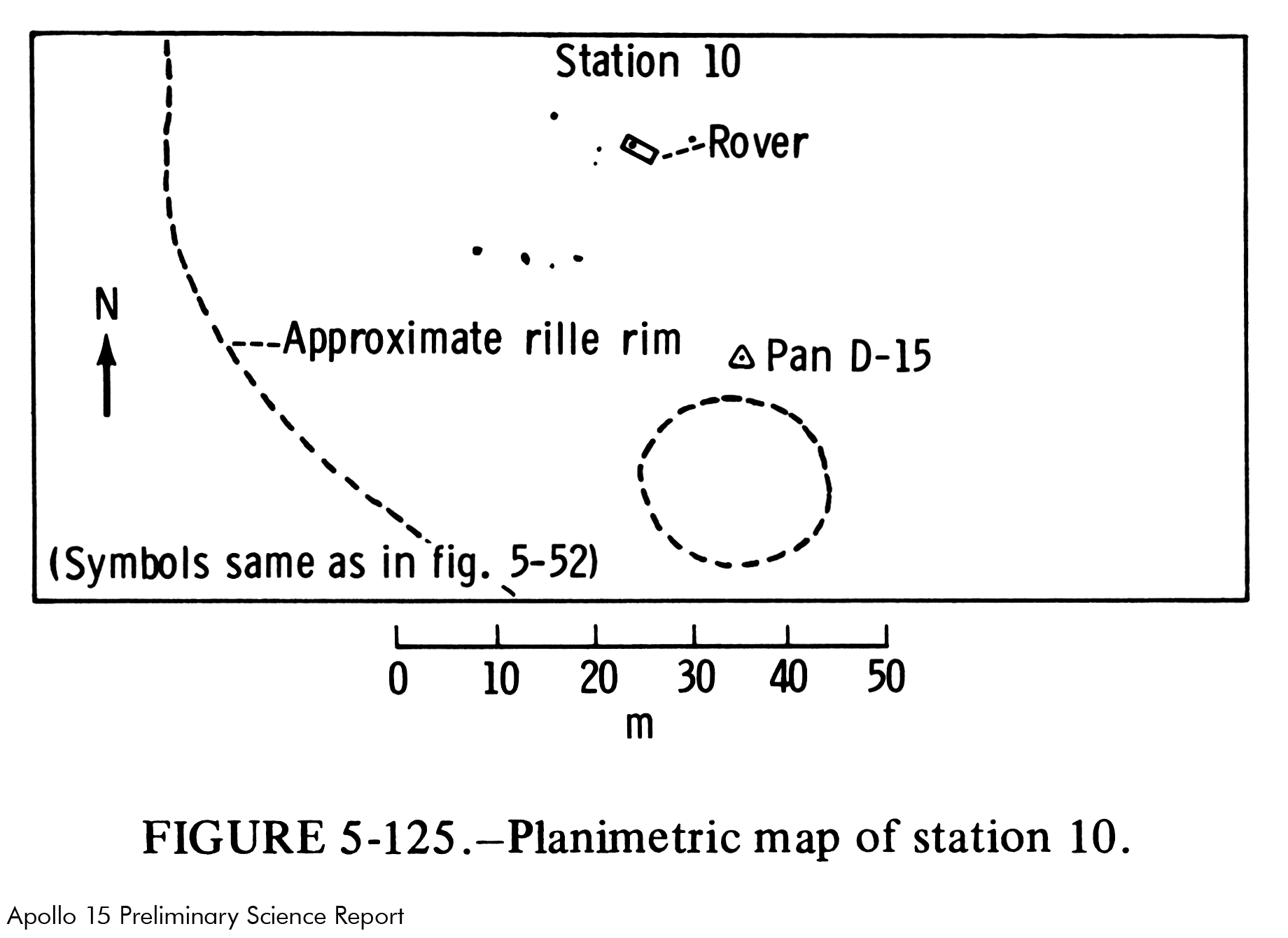 Abbildung 5-125 im Vorläufigen wissenschaftlichen Bericht zu Apollo 15 (Apollo 15 Preliminary Science Report) ist eine planimetrische Karte von Station 10. Krater Rim hat in Wirklichkeit einen Durchmesser von 45 Metern. Beim Einfügen in den Ausschnitt der LROC‑Aufnahme wurde die Karte so angepasst, dass 45 Meter auf der 50-m-Skala dem Durchmesser des Kraters auf der LROC
