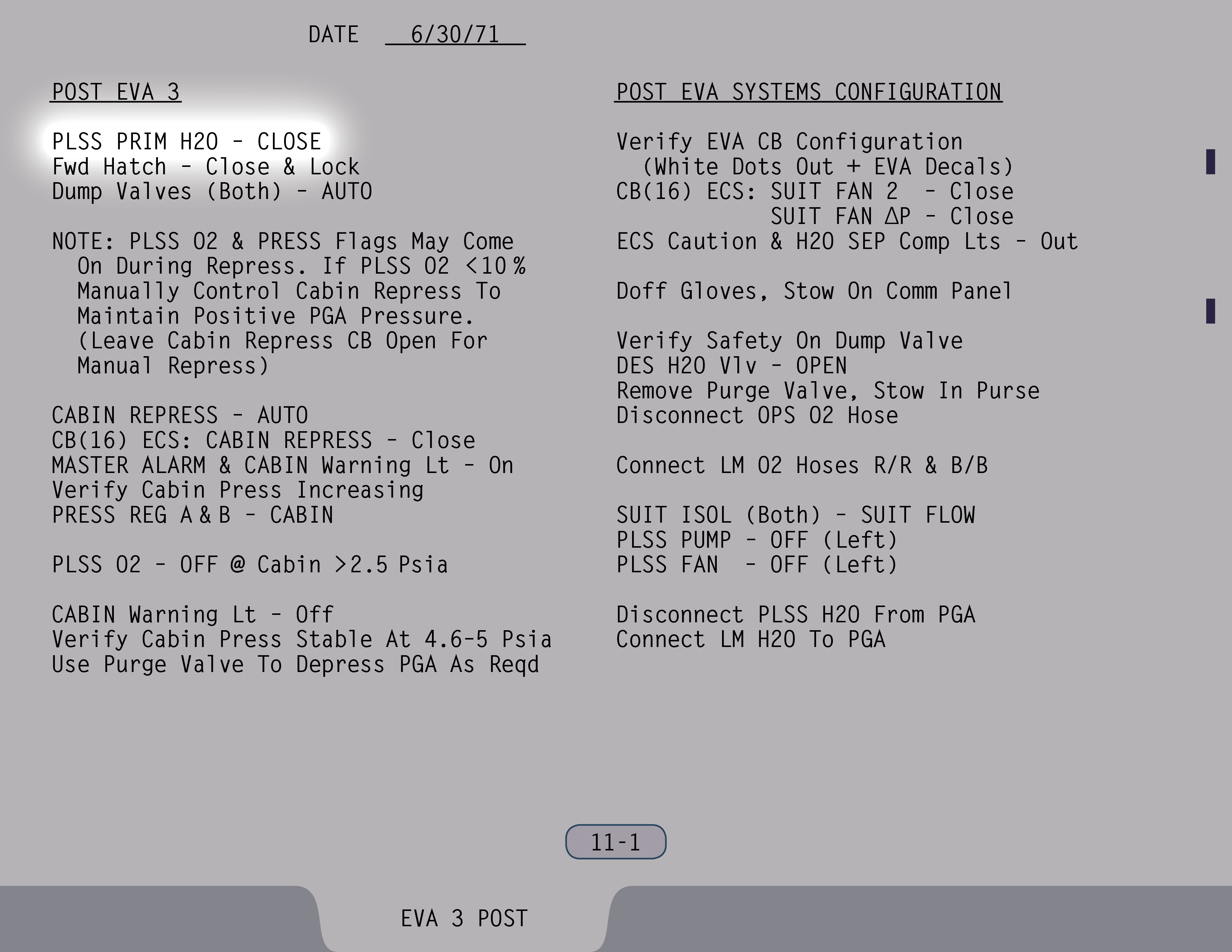 Scott: Also, vielen Dank, Gerry. Wir ziehen unsererseits den Hut vor euch. Alle Achtung, ihr Burschen seid absolut auf Draht und wir sind sehr froh darüber. Denn eins dürfte jedem klar sein, ohne euch könnten wir unsere Aufgabe hier oben nicht erfüllen. (Pause) (zu Jim) Okay. Weiter im Text (SUR 11-1). Warnleuchte KABINE ist aus (Paneel 1). Kabinendruck ist stabil bei 4︱5 (4,5 psia/0,31 bar, Paneel 2). Für Druckausgleich (im PGA