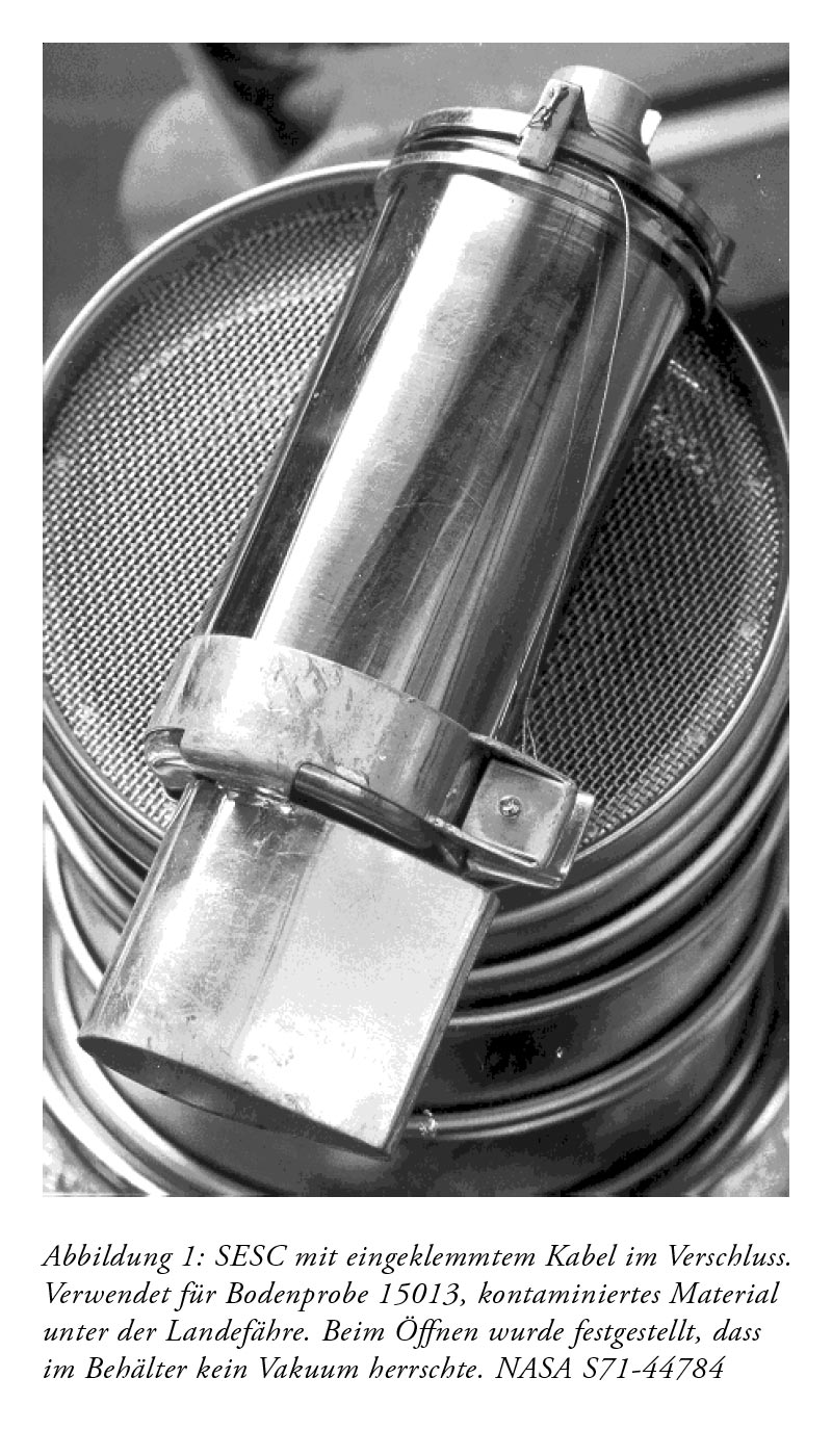 meint er vermutlich das Kabel, welches Deckel und Behälter verbindet. Es handelt sich um ein relativ kurzes Stück und so hatte Dave wohl Schwierigkeiten, den Deckel aufzusetzen. Zudem geriet das Kabel unbemerkt zwischen Metallstreifen und Schneidkante. Das machte es noch schwerer, den Behälter zu verschließen und verhinderte insbesondere die vakuumfeste Abdichtung. Abbildung 1 des Artikels zu Probe 15013 im Kompendium der Proben vom Mond (The Lunar Sample Compendium) zeigt den SESC