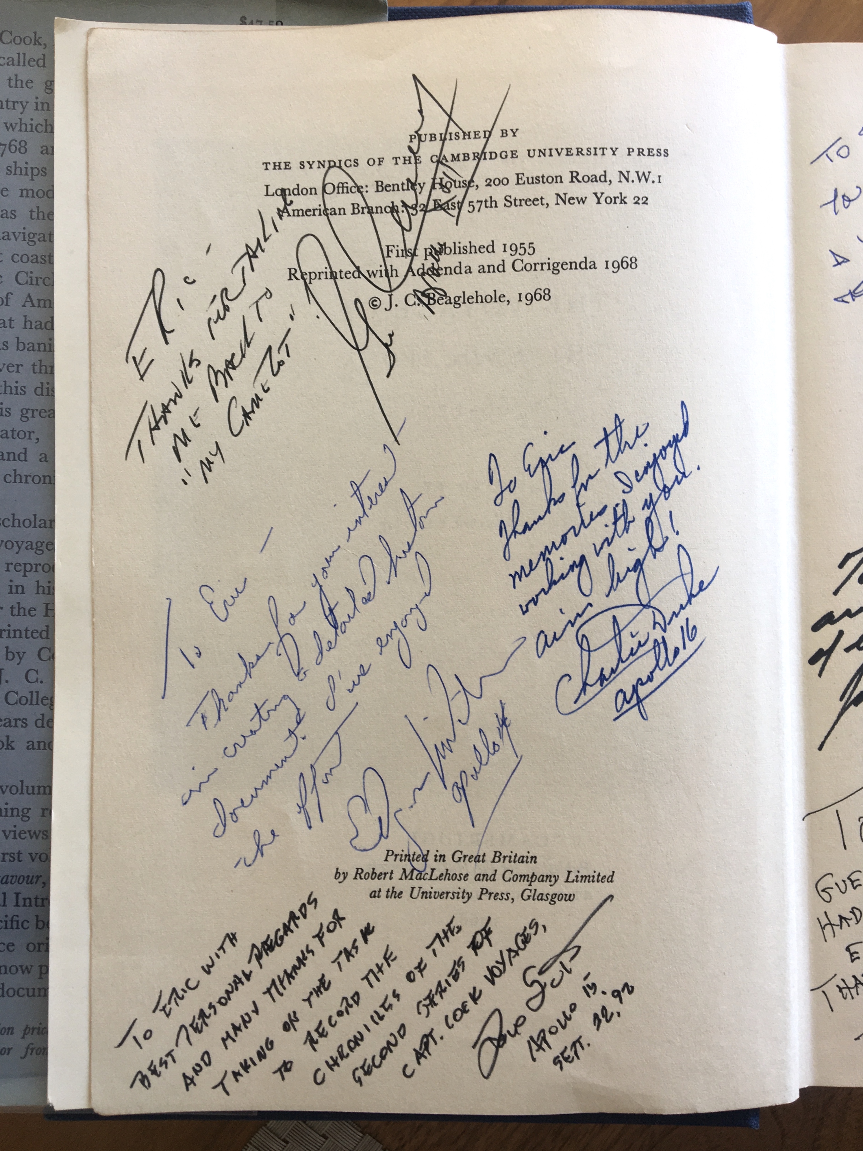 In 1988, I visited Houston to learn something about what was involved in getting work done on the Moon. I began reading the Air-to-Ground transcripts and quickly realized that nothing had been done with this amazing resource. During my earlier readings I had become a great fan of a New Zealand historian named J. C. Beaglehole, who had spent most of his long career studying the European exploration of the Pacific and, in particular, producing the definitive editions of Captain Cook's Journals. It was not hard to imagine the Air-to-Ground transcripts forming the basis of an Apollo Journal. At this time, Jack Schmitt was an occasional visitor to the Laboratory and, on one of his visits, I got an hour of his time to talk about the difficulty of working in the gloves and other issues. We also talked about my Journal idea and, in April 1989, we spent three days together going through part of Apollo 17 EVA-2. We had a lot of fun and decided that the Journal was worth doing. Jack wrote a letter of introduction to the other astronauts....and the rest is history.