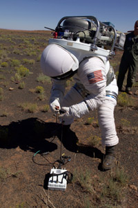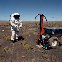 Attached are a series of photographs shot on the west side of Meteor Crater during our recent NASA Desert RATS field exercise. As an adjunct to the primary activities we were pursuing, Dr. Jim Reilly and Dr. Drew Feustel of the Astronaut Office have received some seed money to begin working on field deployable seismic equipment for planetary exploration. One of the tasks they worked on this year was to evaluate the work load, both shirt sleeve and suited, associated with deploying this equipment.