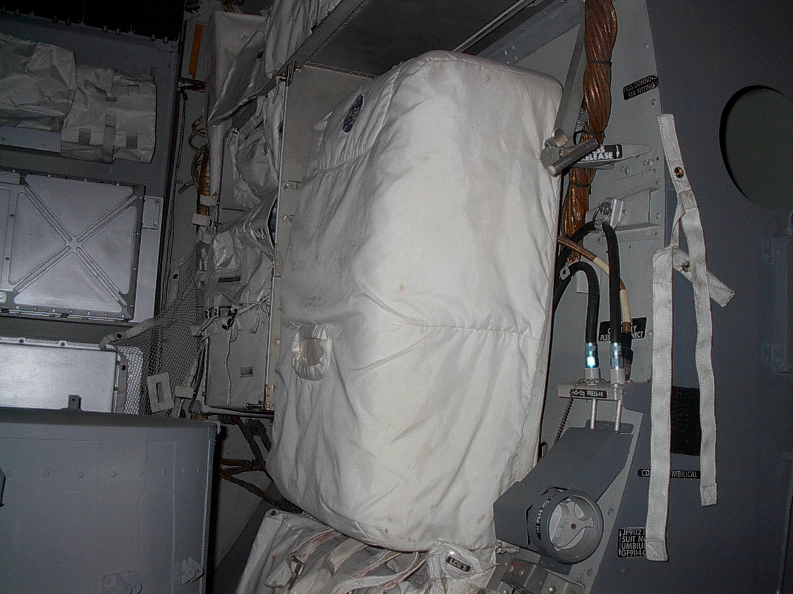 CDR's PLSS was secured to the side bulkhead behind his flight station. The photo shows a view toward the back of the cabin and was taken by Frank and Stacey O'Brien in 2002 at the Cradle of Aviation Museum. A release handle is visible in the larger version of the image.