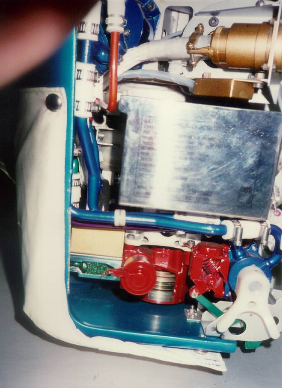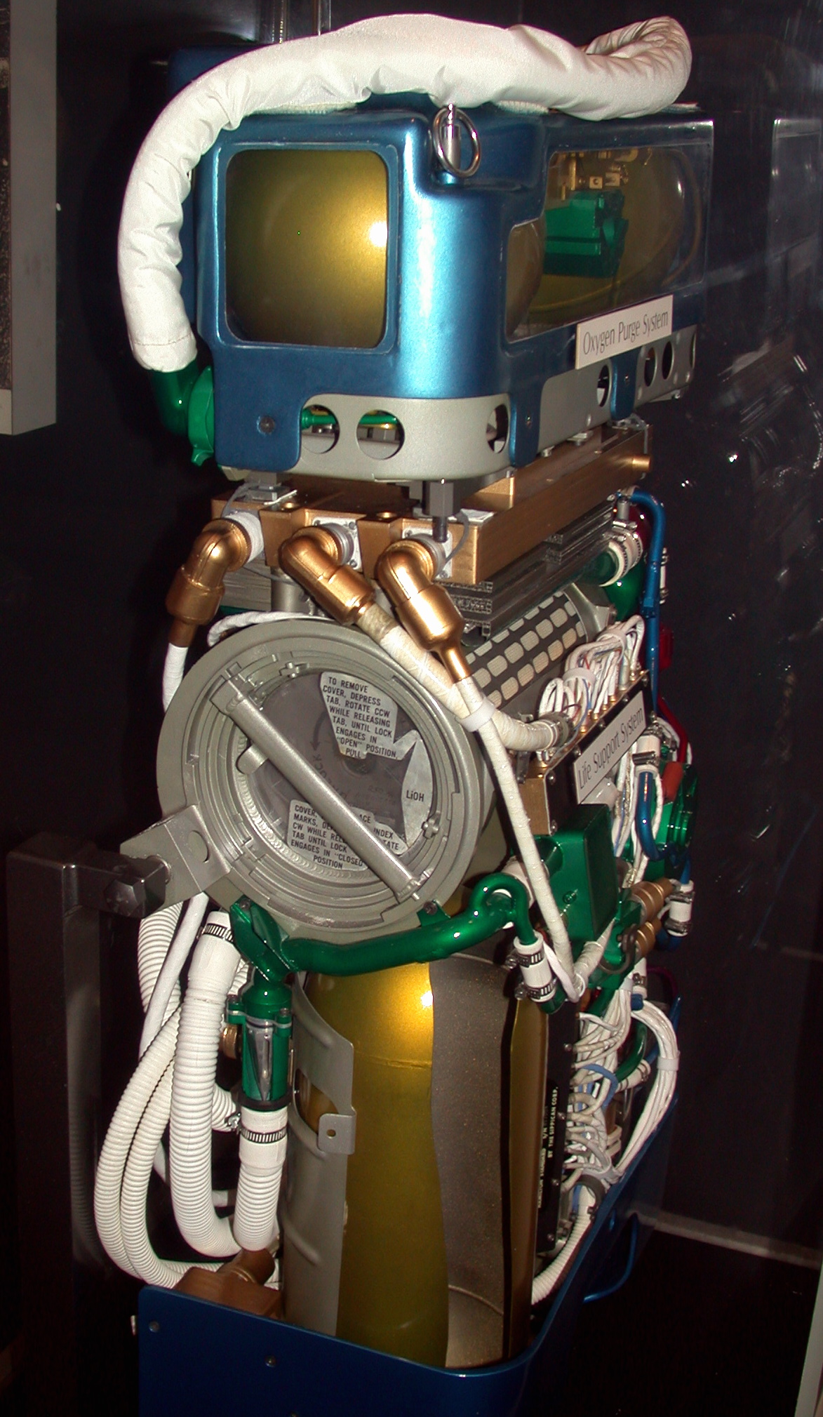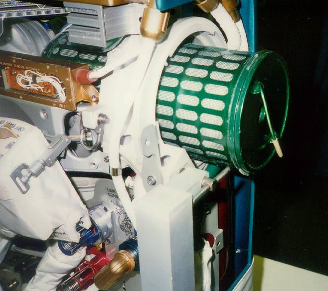 The sublimator and heat exchanger are part of the "return circuit" of the PLSS. Oxygen, warmed by the heat generated by the astronaut's body, is cooled in the heat exchanger before being passed through the lithium hydroxide canister to eliminate exhaled carbon dioxide. Water circulated through the Liquid Cooling Garment (LCG) also flows through the heat exchanger where it gives up heat to a separate supply of cooling feedwater. The feedwater flows into the sublimator, where it is added to a layer of ice and, ultimately evaporates and carries away excess heat. In the foreground, the controls of the chest-mounted RCU are visible. The gold rotary switch selects the radio transmission mode. To the our right of the switch is the oxygen pressure gauge. Five windows on the right display caution and warning flags that alert the astronaut to problems with the PLSS. The guarded switch controls operation of the PLSS fan which moves oxygen out of the PLSS and into the suit.
