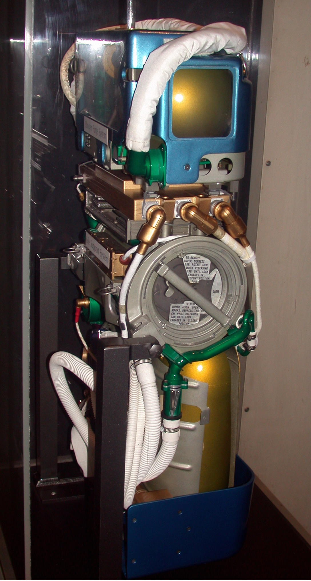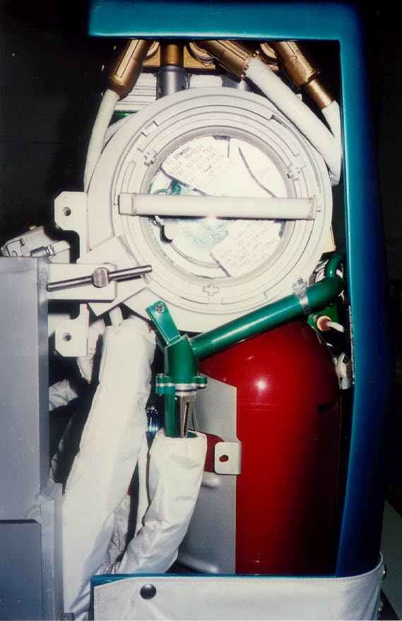 The lithium hydroxide canister can bee seen in green and white, underneath and behind the sublimator.