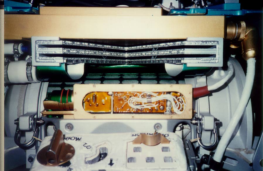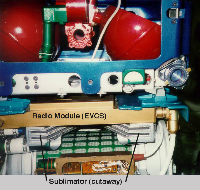 A close up view of the heat-exchanger/sublimator (silver cutaway structure), radio module (gold), and the lithium hydroxide (background, in green/white). The Remote Control Unit (RCU), in the foreground, is mounted on the crewmember's chest.