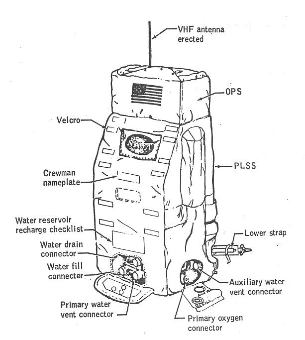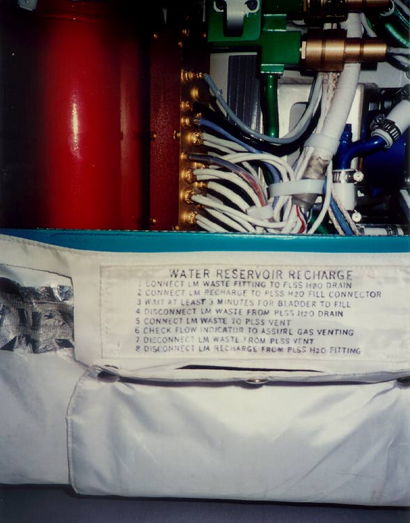 Water recharge station. On the lower, back side of the PLSS are the fittings for the cooling feedwater and waste water storage vessels.