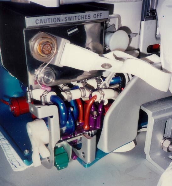 Close-up of the water flow control valve on the astronaut's front, right-hand side of the PLSS is shown on the left. The metal bracket underneath the PLSS is to support the unit for display.