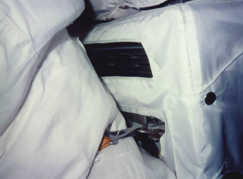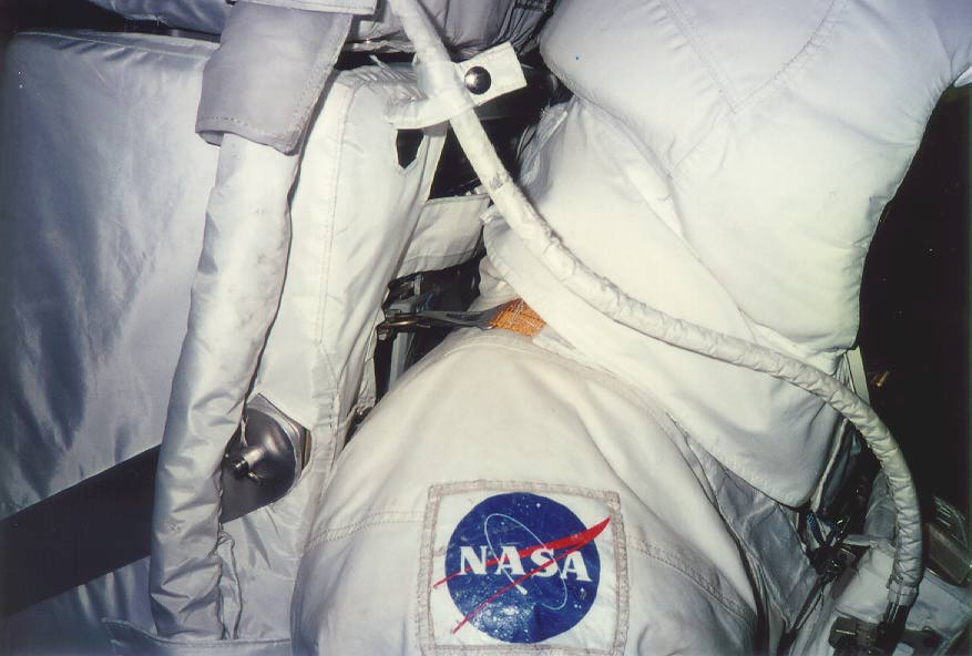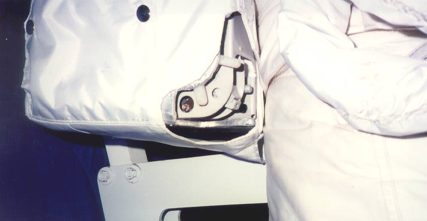 Astronaut's left side shoulder harness PLSS attachment. The strap passes through a sleeve that runs from the top ofthe shoulder to the upper chest attachment point. This sleeve is hidden by the hood used to cover the astronaut's helmet. The cutout section in the upper part of the PLSS is part of the display, and is not a characteristic of PLSSs that were used on actual missions.