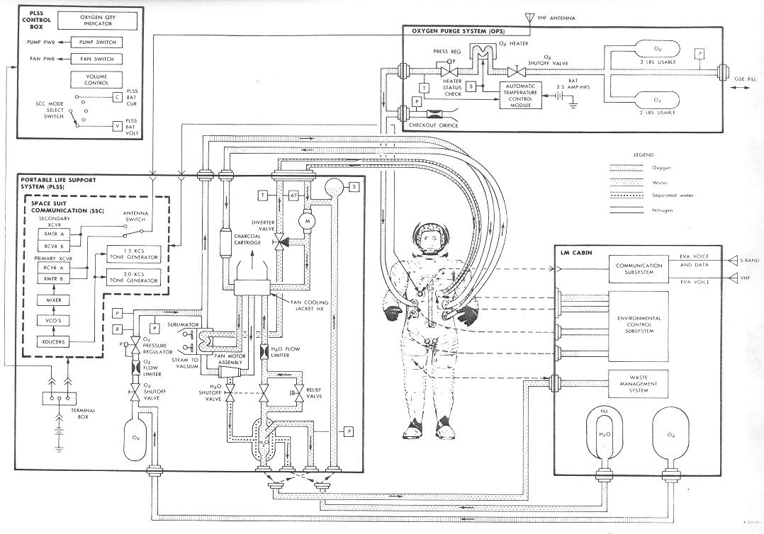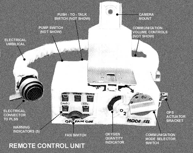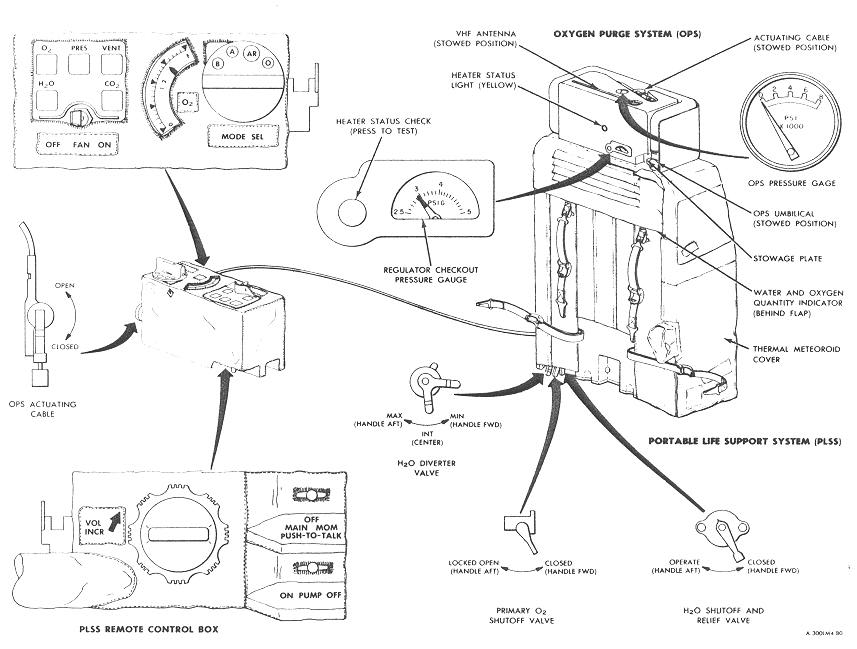 This diagram shows the major components of the PLSS, plus the controls and displays. There are three major components: The Portable Life Support System (PLSS) itself, the Oxygen Purge System (OPS) and the chest mounted Remote Control Unit (RCU). On the PLSS itself, the major controls are located on the front, right-hand corner. Moving inboard, these are the water diverter valve, the primary O2 shutoff valve, and the water shutoff and relief valve. These valves were close to one another and often difficult to reach. Frequently, assistance from the other crewmember was necessary to operate the valves.