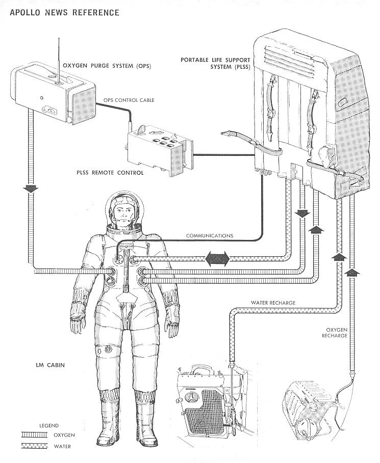 Fully charged PLSSs were loaded onto the LM before launch, which saved considerable time before the first EVA. For subsequent EVAs, the crews retrieved fresh batteries and lithium hydroxide canisters during EVA close-out activities for use the next day. Recharging the PLSS was a six-step process. Usually done as part of the EVA prep, a few crews used spare time at the end of their workday to replenish the PLSS consumables. The process took about 30 minutes for each suit, and each crewmember worked on their own equipment. By staggering tasks, the entire process took less than an hour.