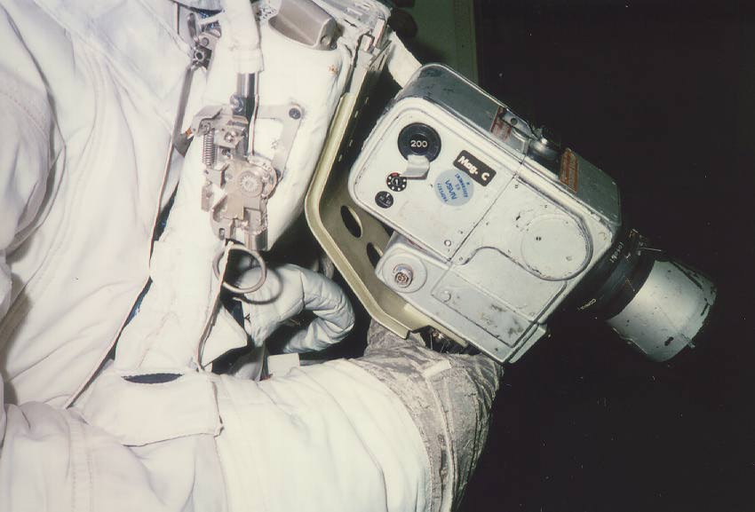Hasselblad camera and mounting bracket. Connected to the front of the RCU, it allowed hands-free carrying and pointing. A trigger on its pistol grip (hidden from view by the glove) controlled the shutter. Interchangeable film magazines (magazine C shown here) allowed easy switching between various rolls of film.