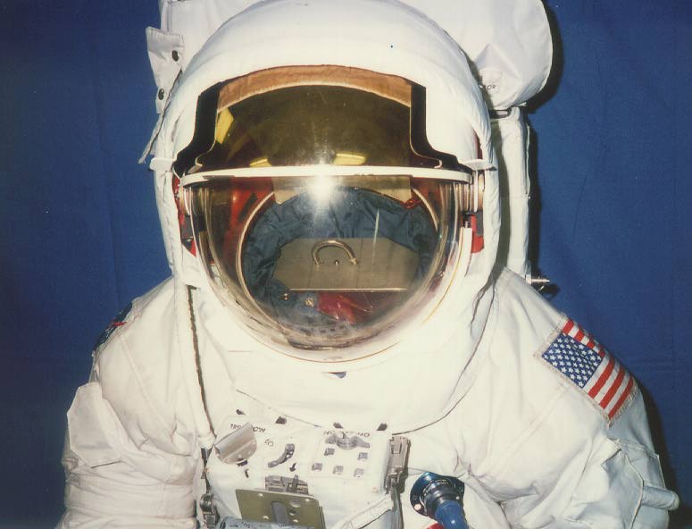 Visor and side shade details are visible in this photograph. Note the oversized tabs used to raise and lower the gold-coated visor and the opaque side shades. The bracket inside the neck ring of the suit is the hanger used when the suit is in storage.